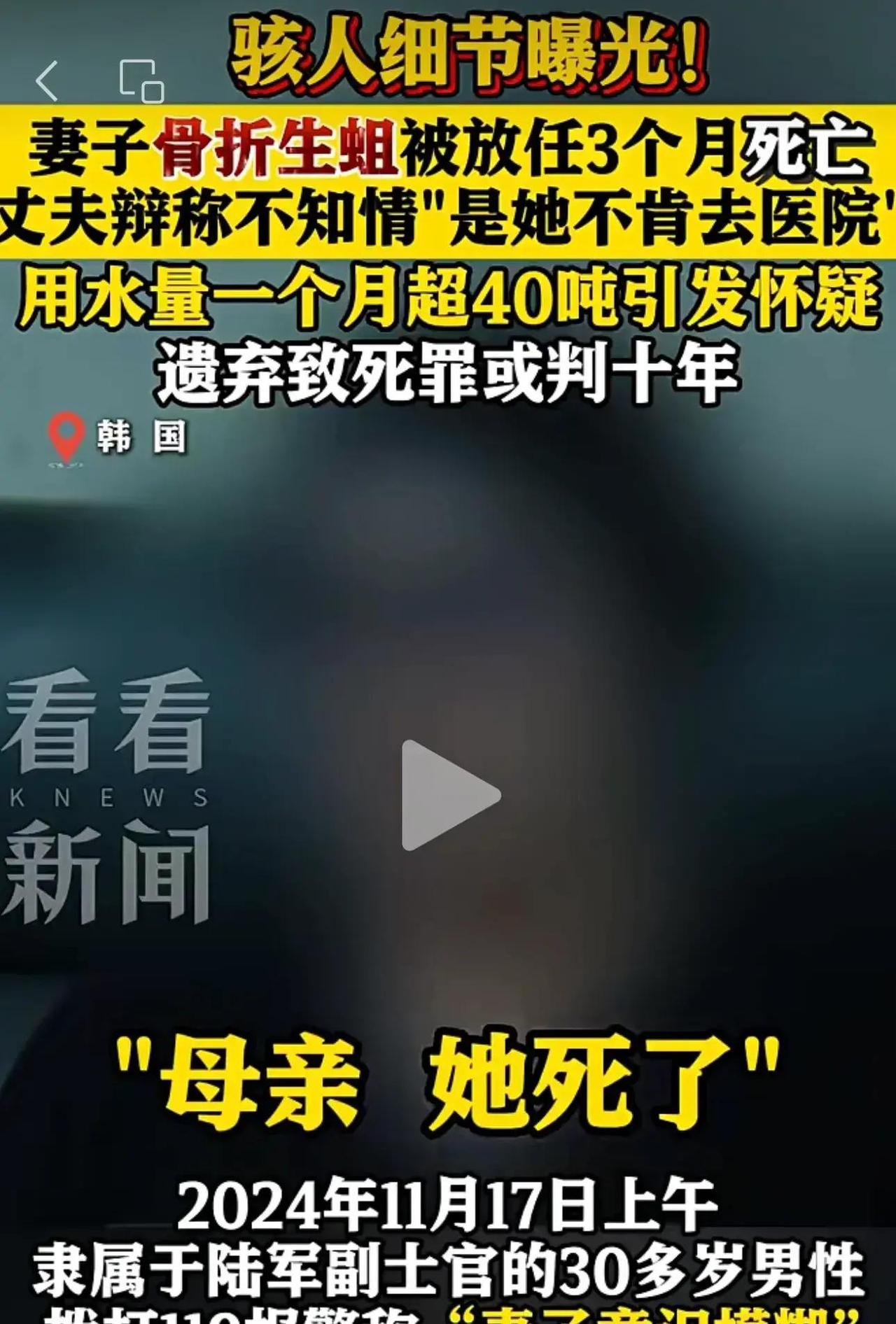 妻子骨折生蛆离世,丈夫“不知情”?冷漠远比悲剧更刺眼女孩生蛆 妻子骨折生蛆死亡丈夫辩称不知情 登上热搜,看完事件细节让人怒火中烧!好好的人因骨折无人照料,最终浑身生蛆惨死,丈夫却以“不知情”搪塞,这真的能洗白他的冷漠吗? 据悉,妻子骨折后还伴有抑郁症,行动受限急需照顾,可丈夫全程不管不顾,放任她独自煎熬三个月。急救人员到场时,妻子伤口腐烂生蛆、浑身污秽,隔天就因严重感染离世。面对质疑,丈夫辩称妻子不愿就医,可高额水费、妻子身上的外伤,还有她写下的求救信,都戳穿了他的谎言,分明是刻意漠视,眼睁睁看着妻子走向死亡。 夫妻间互相扶持是基本责任,更是法律义务,这种放任配偶陷入绝境的行为,必然要受到法律的严惩。可比法律制裁更让人寒心的,是丈夫毫无底线的冷漠,同床共枕的人濒死挣扎,他却能置身事外,早已丧失了做人的基本良知。 这场悲剧不仅是一个家庭的悲剧,更警示着所有人,婚姻里的责任不能丢,对身边人的苦难更不能冷眼旁观。法律会还逝者公道,但如何杜绝此类冷漠悲剧,值得每个人深思。 你觉得丈夫的辩解能让人信服吗?面对身边需要帮助的亲人,我们该如何主动伸出援手?欢迎在评论区留言讨论!