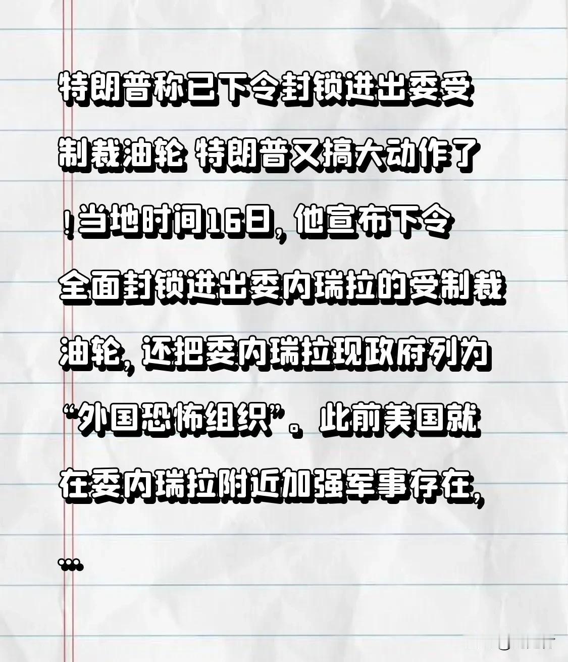 特朗普称已下令封锁进出委受制裁油轮 特朗普又搞大动作了!当地时间16日,他宣布下令全面封锁进出委内瑞拉的受制裁油轮,还把委内瑞拉现政府列为“外国恐怖组织”。 此前美国就在委内瑞拉附近加强军事存在,部署F - 35A战斗机等,军事专家都觉得这不是简单的武力展示,而是在为攻击做准备。美国以“缉毒”为由施压委内瑞拉,6天前还扣押了一艘油轮。委内瑞拉国防部长表示绝不投降,全国严阵以待。美国这一系列操作,明眼人都看得出是想在委策动政权更迭、进行军事扩张,真是霸权行径啊! 委内瑞拉战局 委内瑞拉的困境 守护委内瑞拉