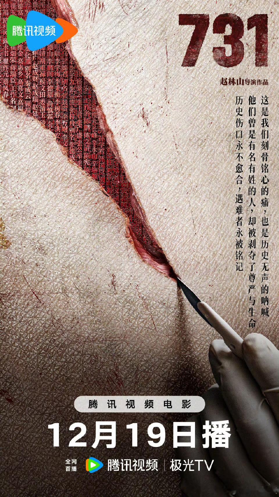 9.18上映的电影731定档12.19国内网播。影片以侵华日军731部队在中国东北进行的细菌实验为背景,通过一个小人物的曲折命运,揭露731部队的罪行。