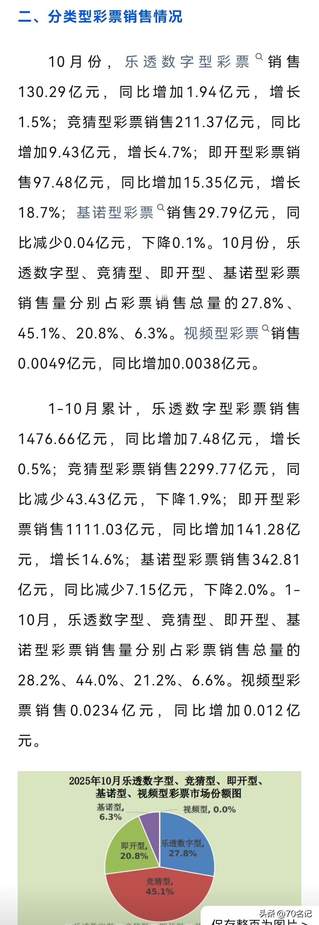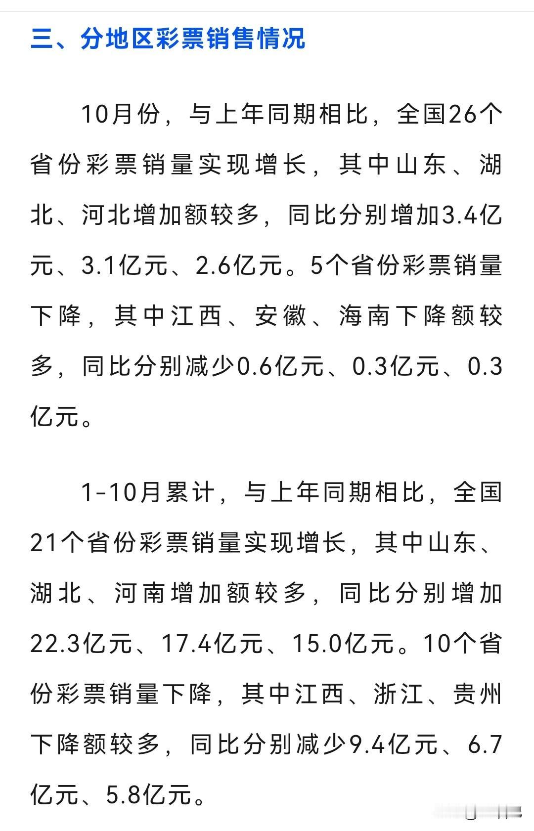 不得不佩服彩民,这是即便勒紧裤腰带也要买彩票,就为买个希望、买个梦想? 1 - 10月累计,全国彩票销售总额达5230.30亿元,较去年同期增加98.19亿元,涨幅为1.9%。其中,福利彩票机构销售额为1747.57亿元,同比增长28.22亿元,增幅1.6%;体育彩票机构销售额为3482.74亿元,同比增长69.97亿元,增幅2.1%。 祝愿人人梦想成真! 彩票 中国体育彩票 中国福利彩票 大乐透 双色球 排列三
