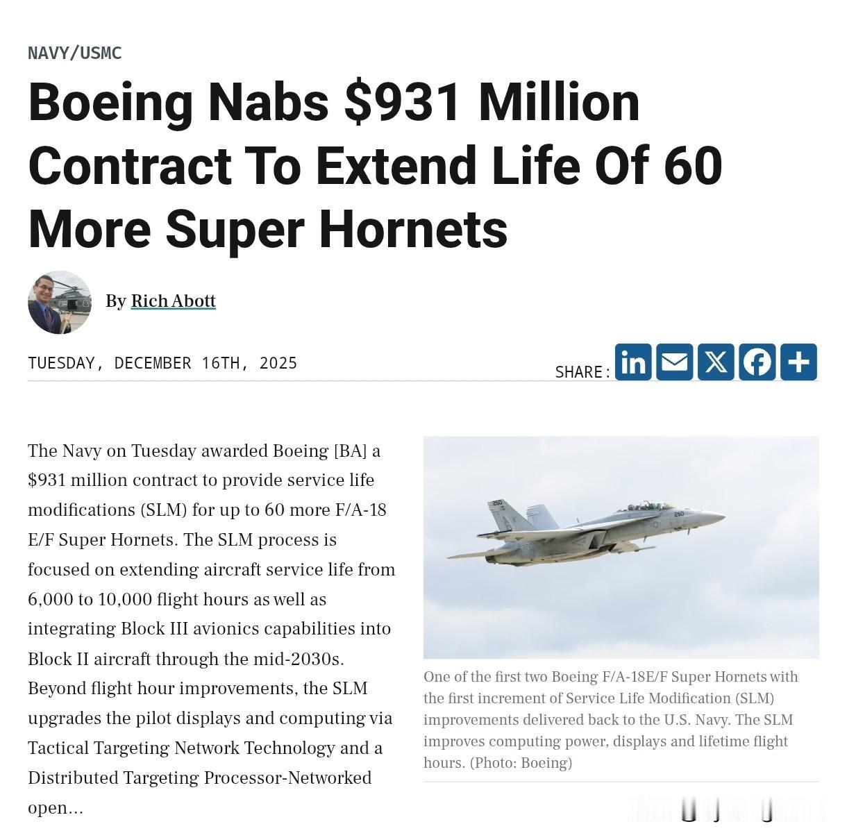 🇺🇸2025年12月16日,美国国防部授予波音公司一份合同,用于升级至多60架F/A-18 E/F“超级大黄蜂”舰载战斗机,将其服役寿命从6000飞行小时延长至10000飞行小时。 该合同价值9.31亿美元。 升级工作计划于2028年11月完成。