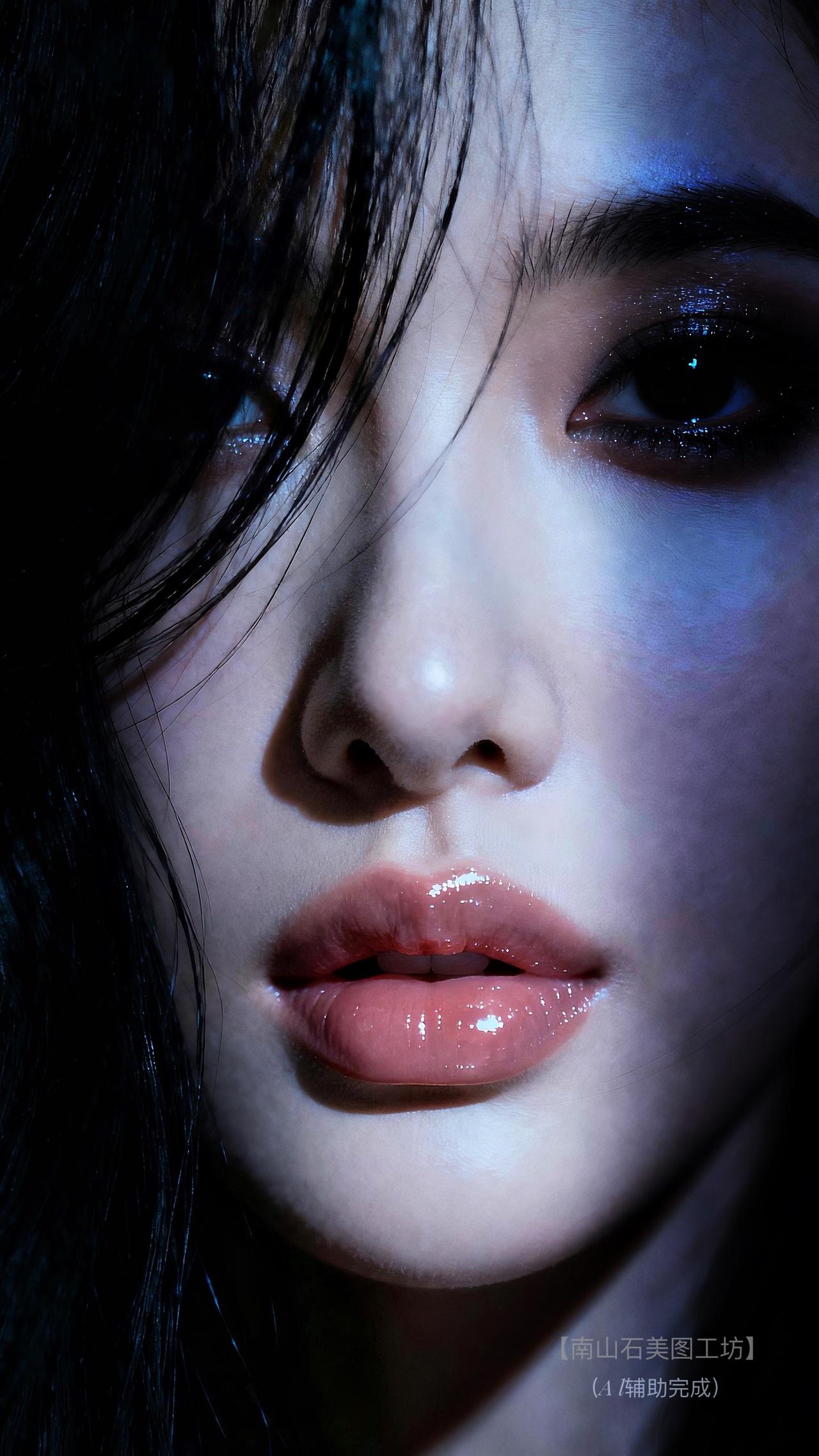 暗调光影里,乌黑发丝如瀑流转,眼波漾琥珀辉,唇若绯玫轻绽。明暗交织间,清冷与明艳