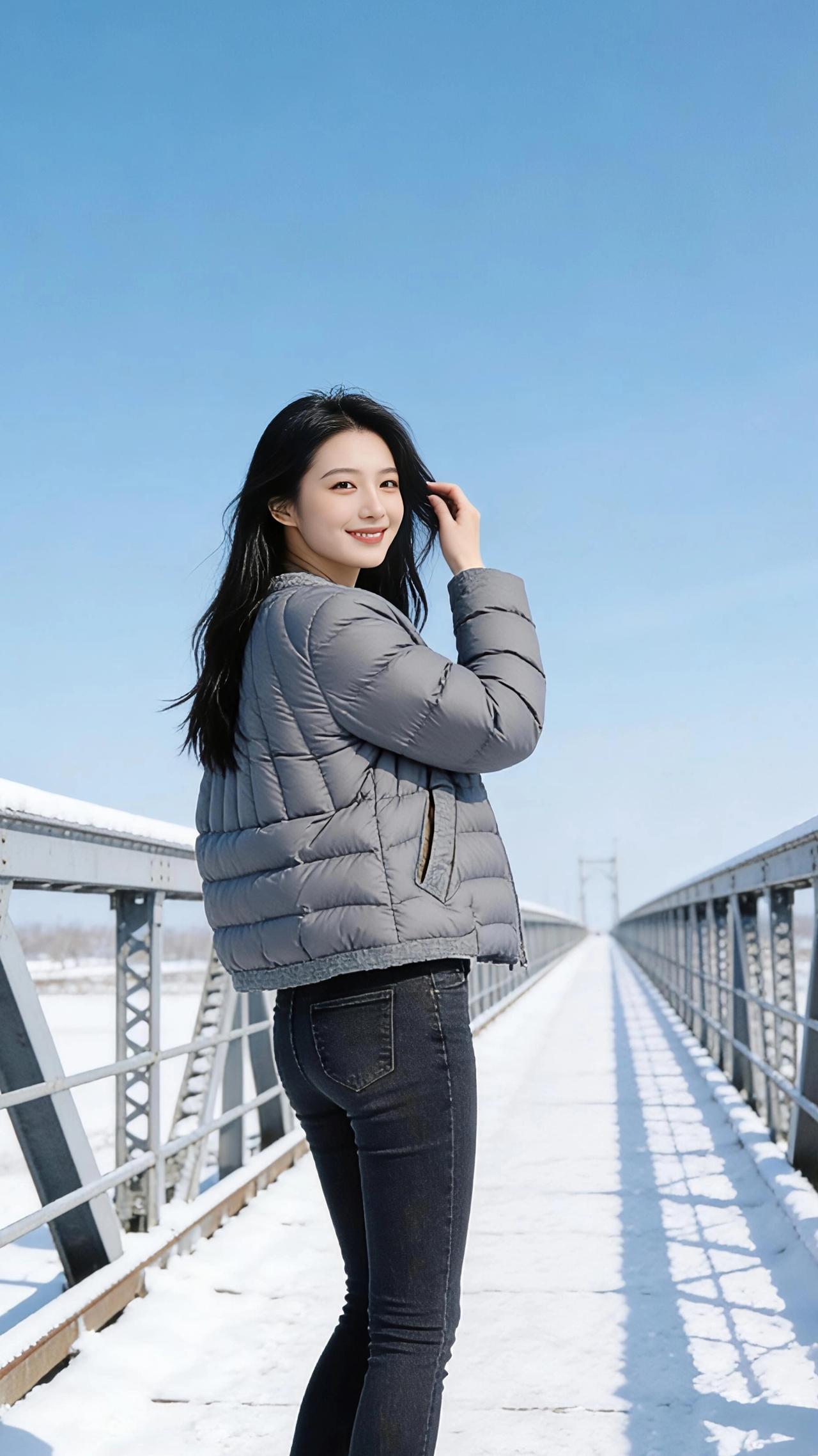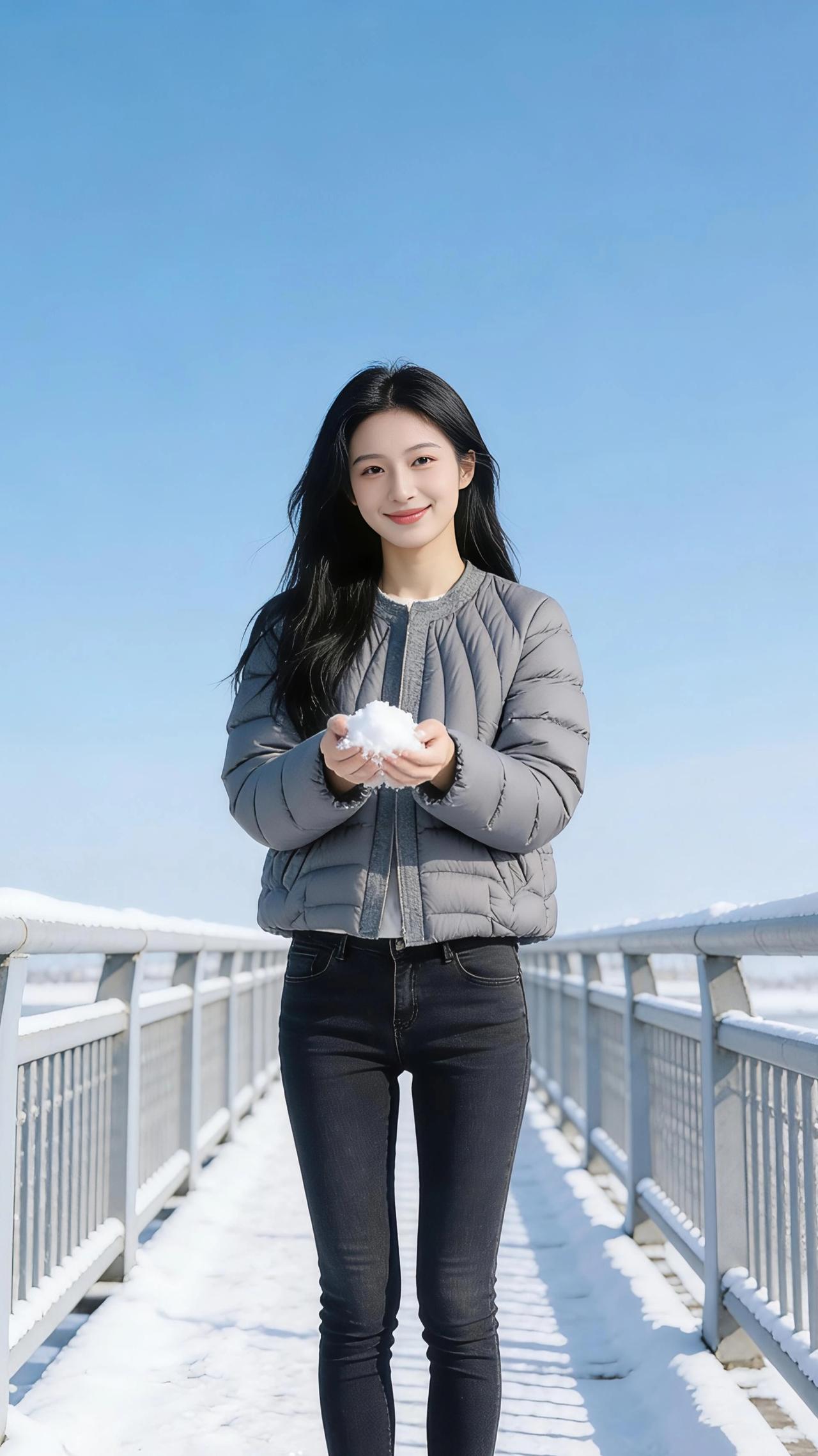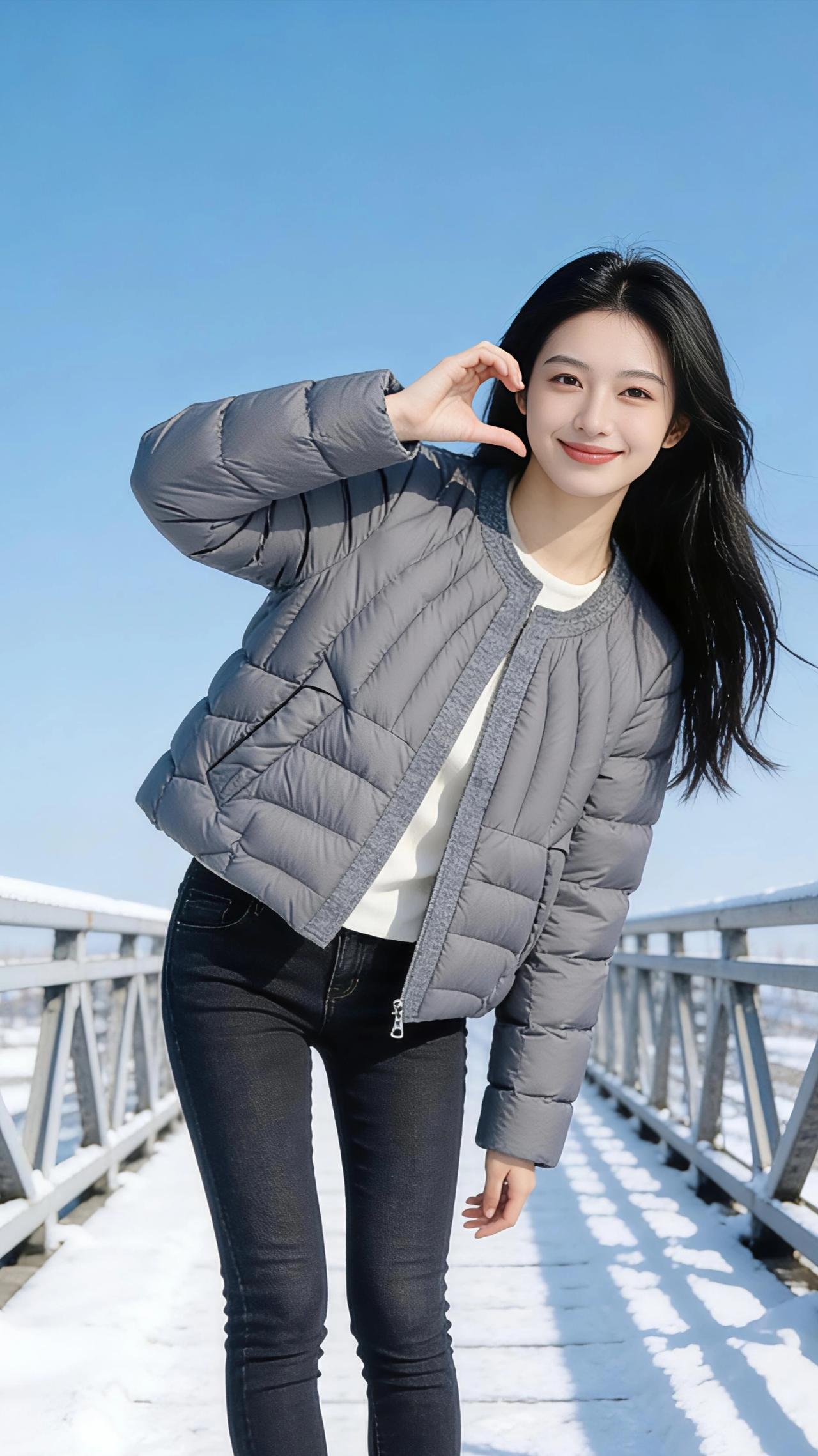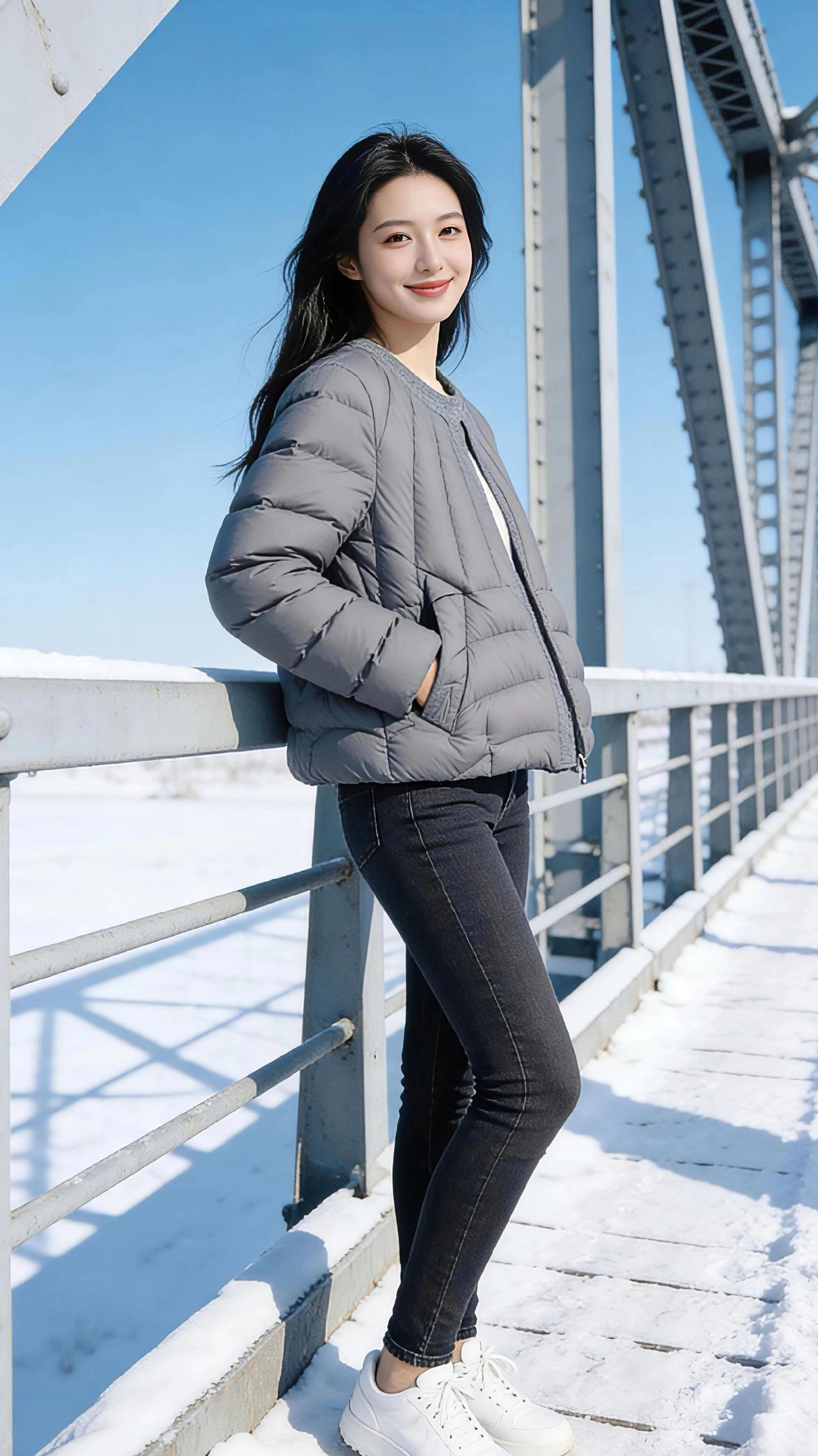 雪桥暖阳 冬日的风掠过江面,卷着碎雪扑在钢铁桥栏上,却被头顶的晴蓝揉碎了寒意。我立在覆雪的桥板上,灰色薄羽绒服裹着周身,指尖触到的雪团凉丝丝的,却抵不过阳光落在肩头的温软。 抬手比出半轮心影,框住的是澄澈如洗的天,还有桥那头望不尽的雪原。长发被风撩起几缕,拂过脸颊时,像触到了冬日里最轻柔的絮语。转身倚着栏杆,牛仔裤的裤脚蹭到积雪,发出细碎的声响,脚下的白与远处的白连成一片,天地间只剩蓝与白的交响,还有这抹灰扑扑的暖。 捧一捧雪在掌心,松松软软的,像攥住了整个冬日的温柔。阳光穿过雪粒的缝隙,在指缝间跳荡出细碎的光。这座雪桥成了冬日的渡口,渡我避开尘世的喧嚣,只与暖阳、白雪,还有此刻的自己相拥。风还在吹,却吹不散唇边的笑意,原来冬日的美好,从来都藏在这晴蓝下的一隅温柔里。 高级感穿搭 小个子穿搭 冬款穿搭 棉服外套