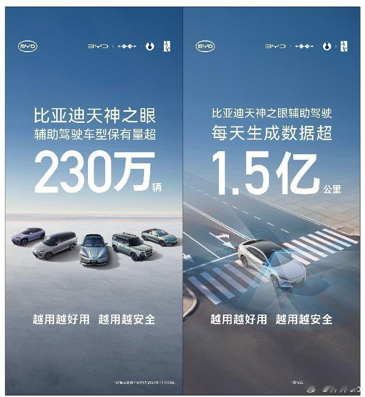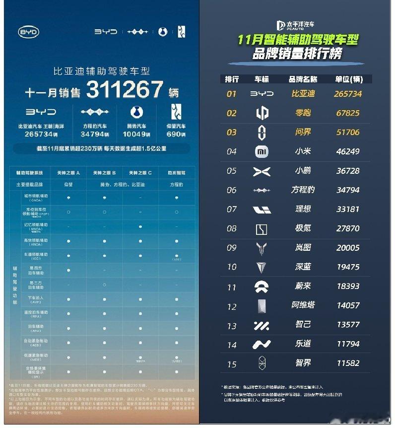 大数据模型是这样的,体量越大提升的能力就越强。刚刚比亚迪公布了11月搭载天神之眼辅助驾驶系统车型的销售数据,全月销售311267辆。其中,比亚迪王朝与海洋系列贡献265734辆。另外,截至2025年11月底,比亚迪搭载“天神之眼”驾驶辅助系统的车型累计销量已突破230万辆,持续蝉联中国辅助驾驶车型销量及系统装车量榜首。