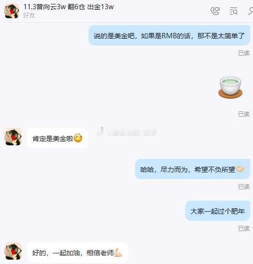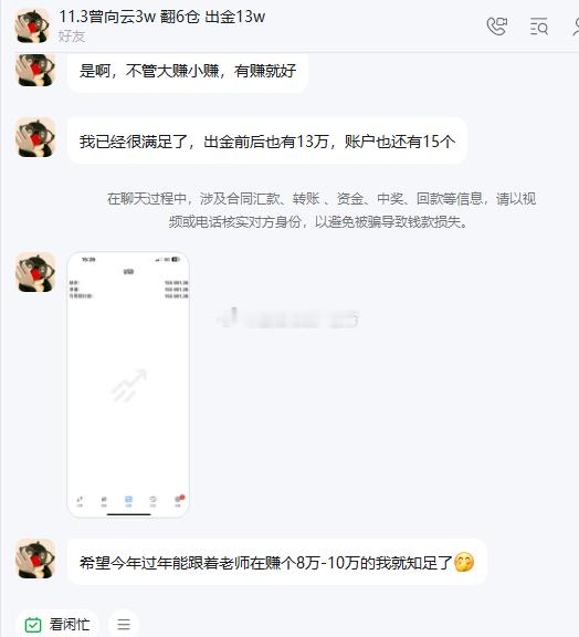 难关落地,后续大顺又大利 刚刚收到小云的消息,阿姨今天做腿部钢筋取出手术。想到上个月3号她刚来找我时,那句“想为母亲挣手术费,给家里医疗添份保障”还热乎乎地在聊天框,如今手术费稳稳落地,账户里的数字还在为这个家继续生长。一个半月,3万本金起航,上一单平仓后账户停在155901美金。(上方备注确实忙忘了,但改不改都不影响赚钱,就像煲汤不在乎用哪个锅——反正都是满满的营养) 一个半月的操作过程中,小云已经提了13万金到卡里,刚好赶上今天的手术。看着这姑娘从忐忑新手到从容操盘,每次挂单都像在为母亲的康复倒计时。如今手术顺利完成,账户里还留着十五万多美金!距离过年还有两个月,她说想再赚个十万八万,给家里过个暖洋洋的年。我说:放心,我们一起。说实话,指导这些年,最动人的从来不是数字跳动,而是屏幕背后那些具体的心愿。有人想换套离医院近的房子,有人想让孩子安心读书,小云只是想母亲不再为手术费皱眉。黄金K线波动的轨迹,最终连成了爱的圆周率。也让我们相遇我的责任,就是让这些朴素心愿,在风浪市场里安全靠岸。所以:每天16小时在线盯盘,因为知道每个仓位都托着一个家的温度,每单必带止损,就像出门总要给家人报平安,凌晨三点回复消息是常态,毕竟梦想不按时区作息如果你也有想守护的人,有还没实现的医疗保障、债务清零、或简单的“过年能让爸妈挑年货不问价钱”!!!那就别再让资金大小困住脚步。大资金有航母打法,小资金也有快艇策略,关键是有方向、有伴、有系统。私信老方,说说你的情况和目标。能帮的,我定全力以赴。就像对小云说的:市场永不关门,但家人的等待有温度,我们的任务,是让温暖赶得上时间。(无论1万还是10万起步,关键是要起步。私信留言“守护”,让老方为你的年关助力一波)黄金 金价 老方实盘为你、为梦想、为家庭共同守护 金油趋势实战大师-老方