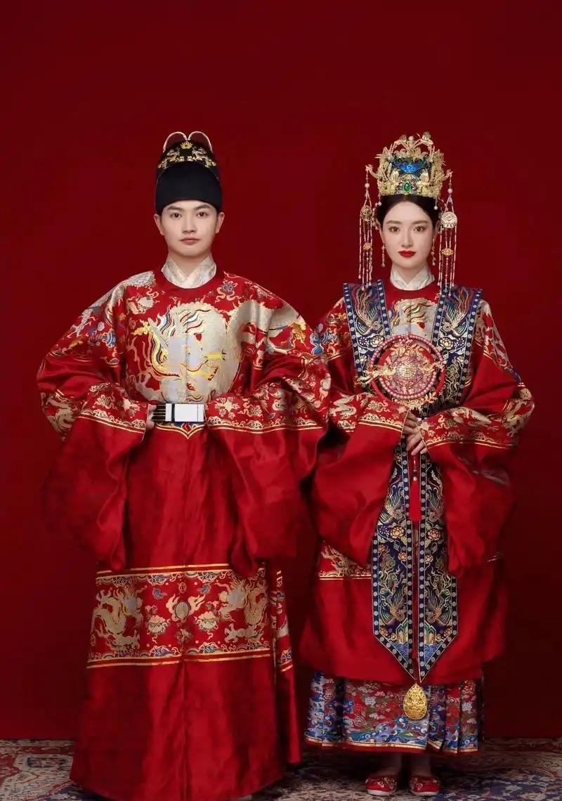 朱元璋规定“凡我大明百姓,新婚当日、新郎皆可穿九品官服,见官大一级,称为"新郎官"…”马皇后则补充“凡是我大明女子,无论贫穷贵贱,嫁为人妇举行婚礼时,皆可穿戴凤冠霞,可称为"新娘官"…”可能这就是新郎官的由来吧! 洪武年间的应天府街头,豆腐贩子张阿三正骑着高头大马招摇过市。 青布官袍罩在他常年挑担的瘦肩上,乌纱帽翅随着马匹颠簸晃晃悠悠,迎面走来的县太爷竟主动侧身让路。 这荒诞的一幕,源自大明开国皇帝夫妇亲手凿开的等级制度裂缝。 新郎官的九品官服并非真金白银打造,青袍用的是粗布染青,乌纱帽里塞着麦秸支撑。 即便如此,这套行头仍让寻常百姓在大婚当日体验到“见官不跪”的体面。 马皇后更让绣娘用绒线代替珍珠,粗布仿造云锦,让贫家女子也能顶着凤冠、披着霞帔,在鼓乐声中做一天“新娘官”。 朱家夫妇太懂底层滋味了。 朱元璋讨饭时见过地主家儿子成亲的排场,自己却连块完整的红布都没有;马皇后随夫征战时,亲眼看着小兵用粗瓷碗当酒杯,对着野草拜堂。 这些记忆化作一道圣旨,让每个大明子民都能在人生最重要的日子里,暂时忘却赋税与徭役,挺直腰杆做回主角。 要知道,秦始皇时期穿错衣服可能掉脑袋,唐宋律法里庶民穿丝绸就是犯罪。 但在大明,婚轿路过衙门时,穿官服的新郎可以端坐马上,新娘凤冠上的绒球随着轿帘摆动,像极了紫禁城角楼的琉璃瓦在阳光下闪烁。 这种短暂的身份反转,比任何休养生息政策都更能熨帖民心。 如今中式婚礼上,新郎的大红礼服仍带着九品官袍的影子,新娘头上的凤冠虽已简化,却依然保留着马皇后当年定下的流苏样式。 那些租来的服饰或许廉价,却承载着六百年前一对帝王夫妇对普通人尊严的体谅让每个认真生活的人,都能在人生高光时刻,做一天自己的“官”。