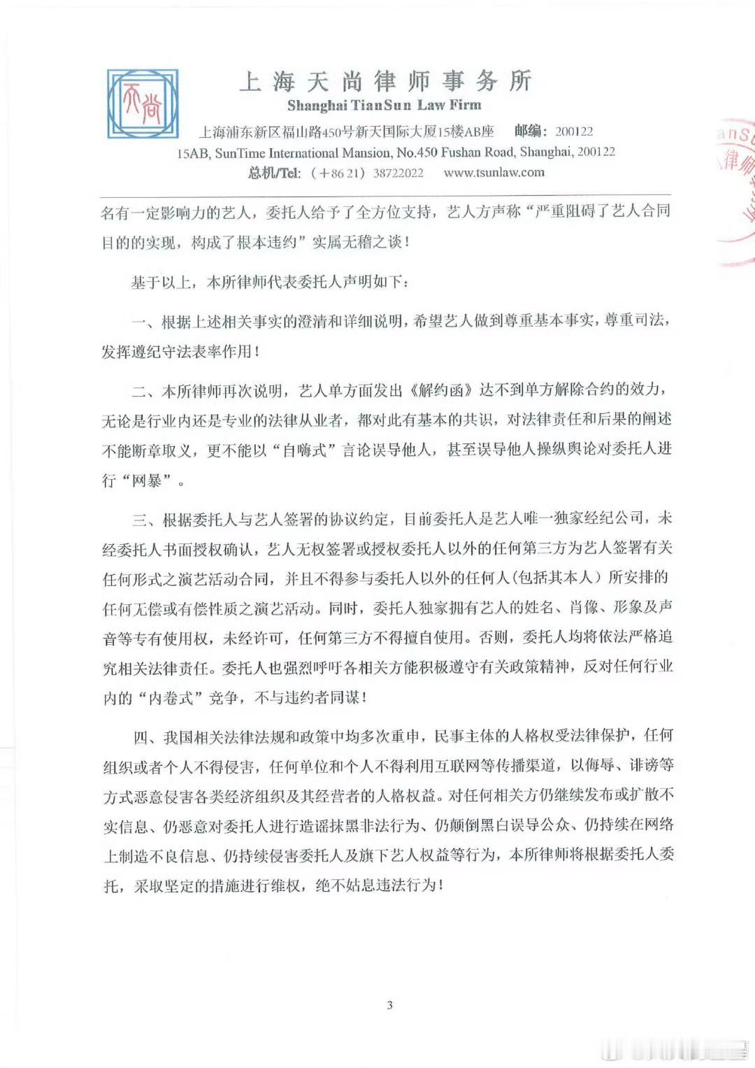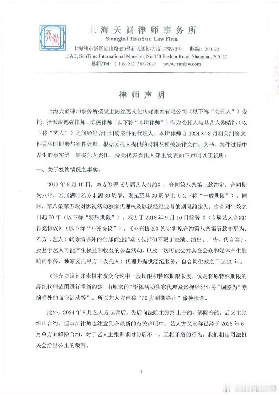 “如果按鞠婧祎所说合约已自然到期,请问起诉法院主张终止合约、解除合约是为何? 补充协议如果不是本人签名,为何要在司法鉴定报告描述上玩一个字的文字游戏、又为何要主动申请撤诉?社会公众期待一个合理的解释。”丝芭再发律师声明回应鞠婧祎经纪合同纠纷