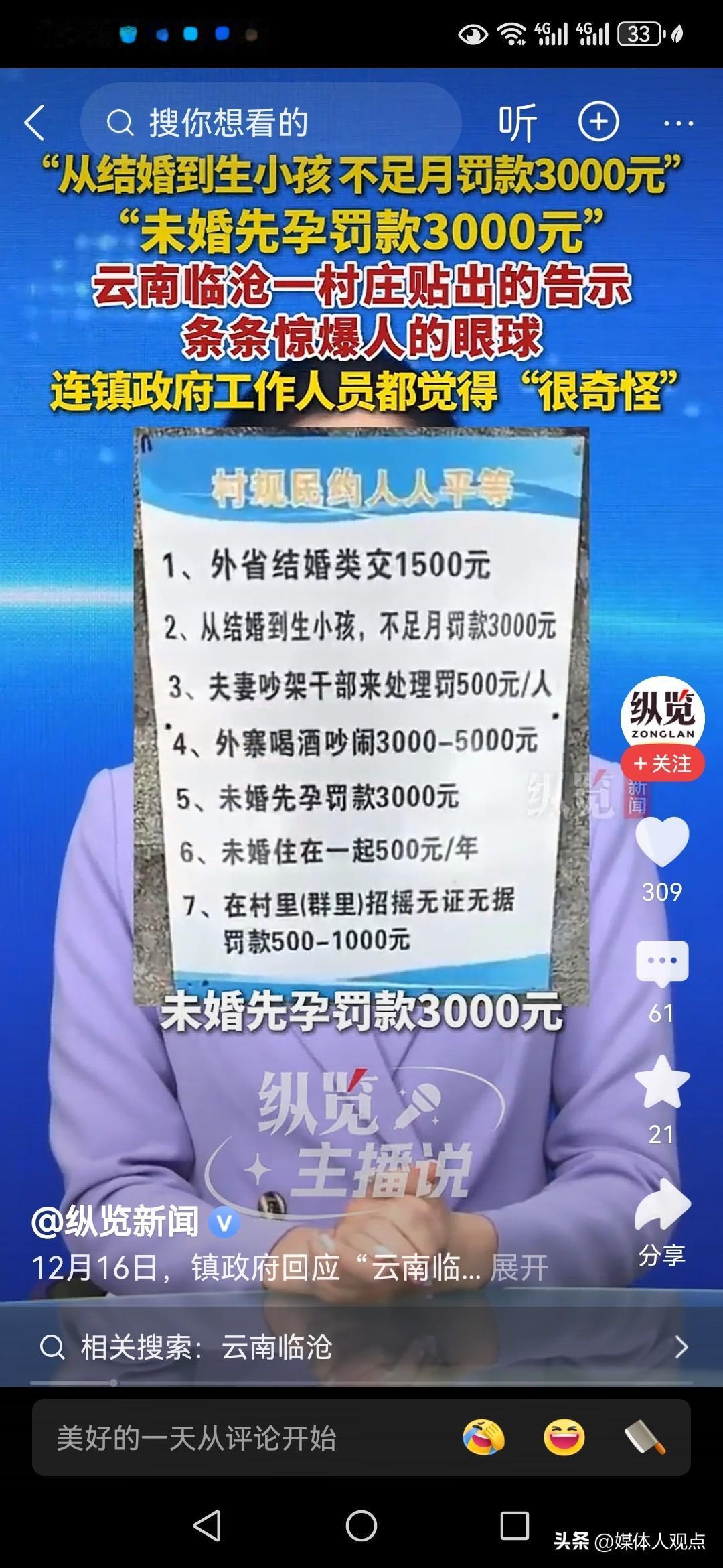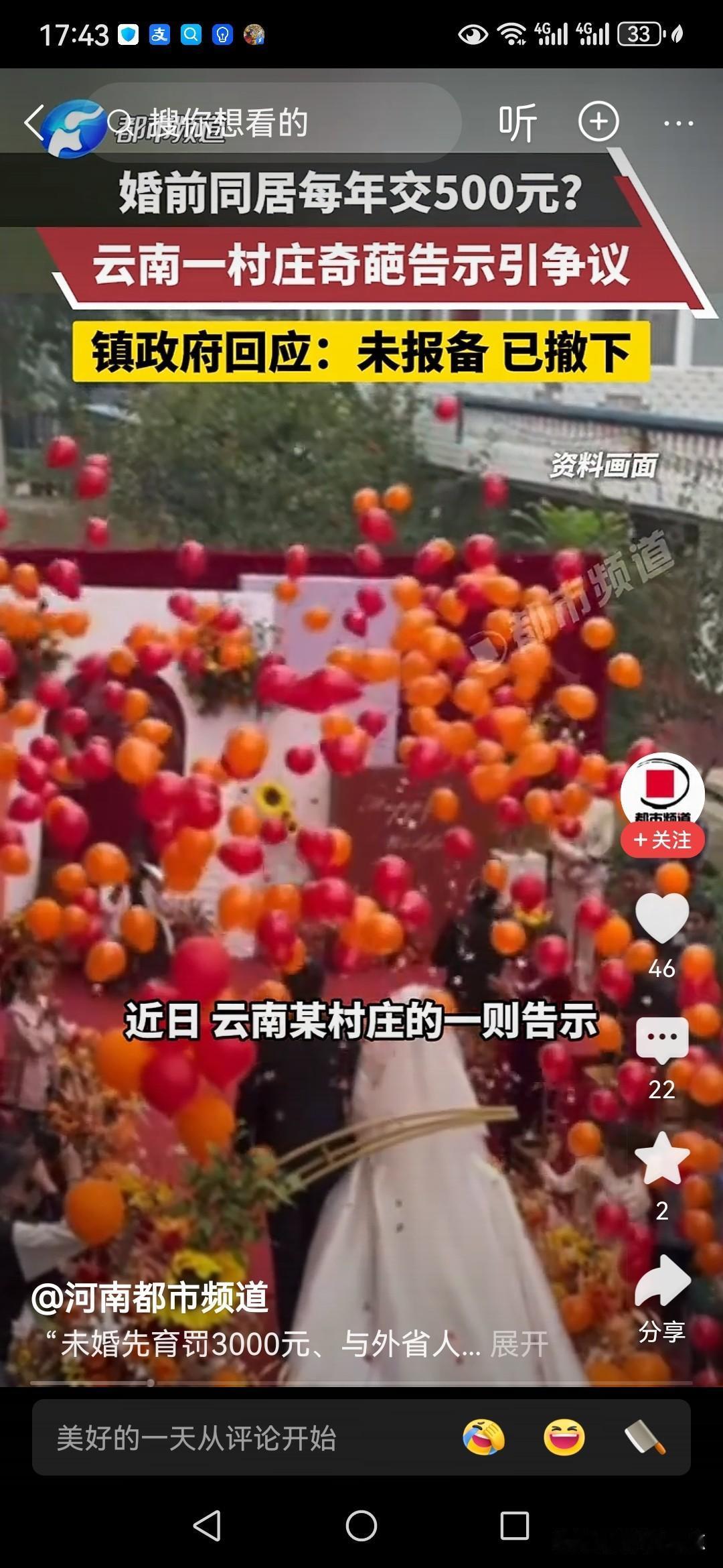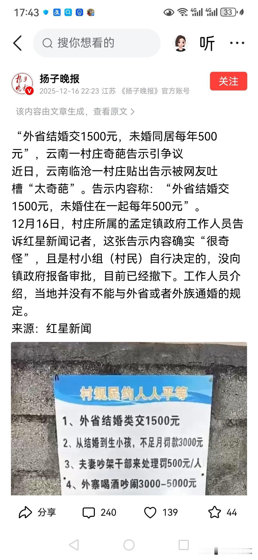 列为看官,这个不是小品也不是相声,这是真事儿,它发生在云南一个小村庄!先别笑,看完您在笑! 近日,云南临沧一个村庄贴出的一则告示,在网上引发热议。不少网友刷到后直呼“看不懂”,吐槽这则规定太离谱。 从网友曝光的内容来看,这则告示里写着两条明确要求:外省结婚要交1500元,未婚住在一起的每年要交500元。这样的条款一出来,很快就被网友截图转发,大家纷纷好奇,这样的规定到底是谁定的,又有什么依据。 这个事儿不是我瞎掰,被好多官媒报道了,不信您在头条搜搜看!