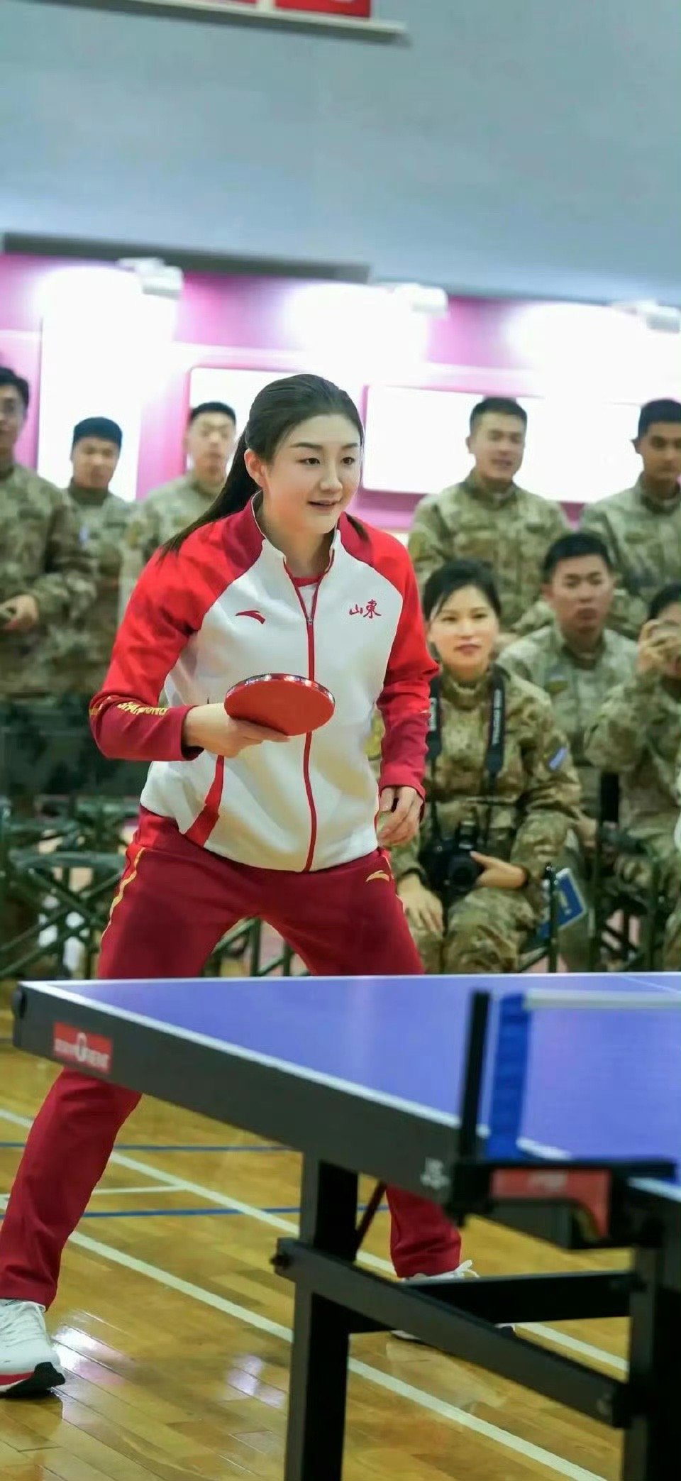 陈梦与部队官兵切磋球技 近日以交流嘉宾身份,和山东队下部队参加“奋斗者”交流会,其间陈梦不仅与部队官兵互动合影,还赠送了签名球拍,并且还与官兵进行了乒乓球切磋。