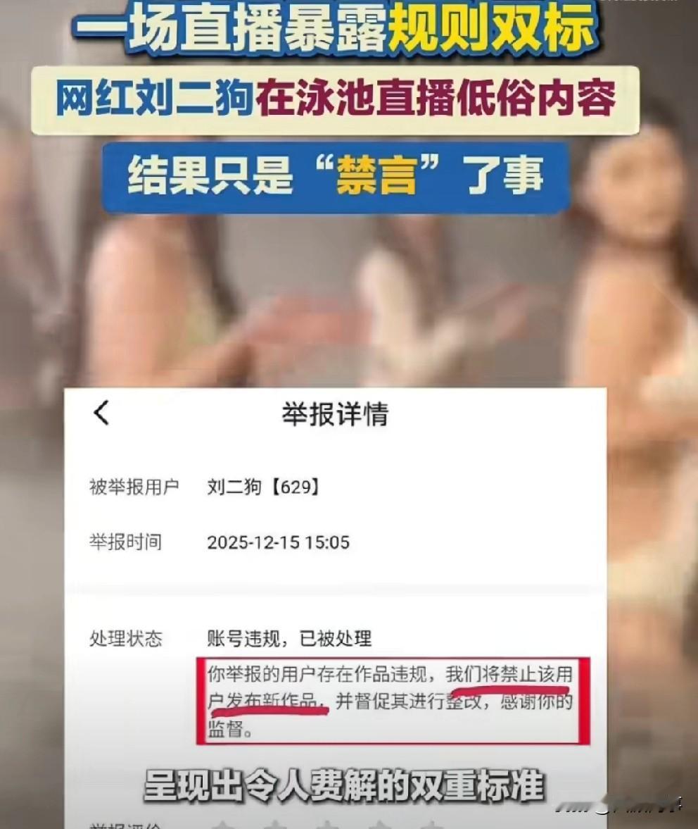 网红刘二狗在泳池低俗直播结果只是禁言了事,媒体质问:4400万粉丝网红有特权吗?这算不算规则双标? 这个所谓的“惩罚”,更像是一次短暂的“带薪休假”。平台的规则在这里呈现出令人费解的双重标准。一个头部主播,能进行三小时的争议直播而未被即时中断。 而同样的内容,如果出自小主播,账号可能早已消失。这种“高高举起、轻轻放下”的处理,很难不让人怀疑,是不是巨大的流量价值,已经让规则本身开始妥协。 这件事真正的警示在于,它暴露了“流量即特权”的行业潜规则。如果顶流网红能够用影响力兑换违规的“宽容度”,所谓的社区规则就失去了基本的公平性,变成了一纸空文。 这损害的不仅是用户体验,更是所有创作者本应公平竞争的环境。直播行业的底线,平台必须承担起首要责任,对顶级主播适用更严、而非更松的标准。否则,“流量为王”的逻辑将不断纵容试探,最终摧毁的是整个行业的公信力与健康生态。