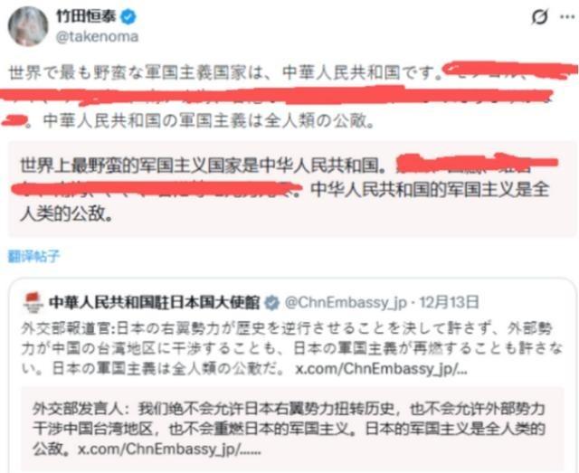 倒反天罡!12月13日,日本明治天皇的玄孙,右翼保守主义代表人物竹田恒泰发文:“世界上最野蛮的国家是中国,并说中国是全人类的公敌。” 竹田恒泰出生在东京一个旧皇族家庭里,父亲是前日本奥委会主席,家族背景跟体育和皇室渊源深厚。他小时候上的是庆应义塾系列学校,从幼儿园到大学一路走来,主修法律,毕业后考到律师证,但没干多久就转行搞媒体和评论。他常在电视上露面,推崇保守主义,主张改宪法第九条,强化日本防卫能力,还写书讲皇室历史和传统,拿过山本七平奖。他办过公司,卖拉面、兑换外币,甚至推销古坟墓地,还在大学兼职教政治课。他的右翼立场明显,常批评亚洲邻国,参与历史否认活动,质疑南京事件规模,在社交平台上发帖积累粉丝,但也招来国际指责。 这个家伙的言论老爱针对中国,过去几年他多次发声,说日本没和中国打过仗,因为那时候是中华民国,还吹嘘日本自卫队能轻松对付中国航母福建舰。最近这次是12月13日,正好赶上南京大屠杀公祭日,他在X平台上直接怼中国大使馆的帖子。大使馆发文批日本军国主义是人类公敌,他反过来贴文说中国才是最野蛮的军国主义国家,还列出蒙古、西藏、新疆、南海、香港这些问题当理由。帖子带日本国旗,灰调背景,很快就传开,日本右翼圈子有人赞同转发,但国际上很多人觉得这是胡搅蛮缠。他后来在采访里补充,说这些基于事实,日本被战后秩序绑住手脚。他这种发言不是头一回了,早几年他就否认历史战争责任,惹得中日关系更紧张。 日本侵华历史铁板钉钉,从明治时代开始扩张,发动甲午战争、日俄战争,到后来全面侵华,造成数千万中国人伤亡。中国清末时闭关自守,挨打后才醒悟主权重要。新中国建国后,没主动挑起过一场战争,反倒是帮周边国家抗击侵略。相比之下,日本战后宪法第九条限制军力发展,这正是国际社会防范它重蹈覆辙的措施。要是日本没那段黑历史,为什么单单它被这么管着,其他国家没这事儿?竹田恒泰的论调就是想颠倒黑白,把日本的锅甩给别人,但事实摆在那,谁也改不了。 他的帖子一出,网上炸锅了,日本媒体头条报道,国际新闻翻译传播,有人嘲笑他没证据光喷脏水。中国外交部没直接回应,但舆论场里很多人指出,这不过是右翼老套路,转移视线。全球网民眼睛亮着,他的言论没拉拢任何国家,反倒让自己成笑柄。日本国内也有声音批评他加剧对立,部分节目减少邀请他。竹田恒泰继续活跃,办公司、写书,但国际形象更差,影响力在右翼小圈子外缩水。历史教训告诉大家,否认过去只会自食恶果,日本要想真正融入亚洲,得先正视那段侵略史。