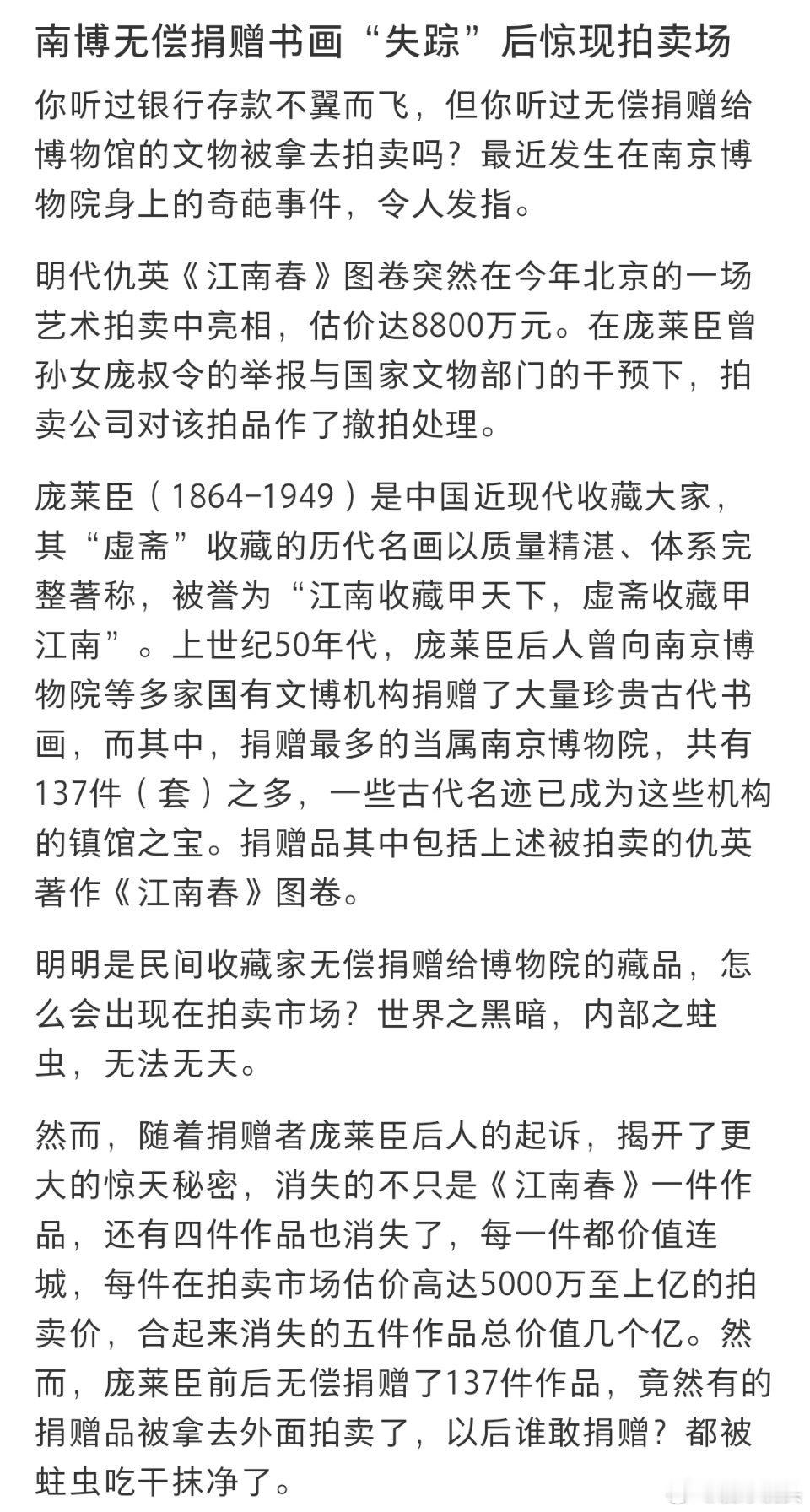 南京博物院获赠名画现身拍卖市场之前还笑话过巴黎卢浮宫怎么这么草台班子,藏品这么容易被偷。结果还有更狠的。如此恶劣的行为,必须严肃处理。 中华文化