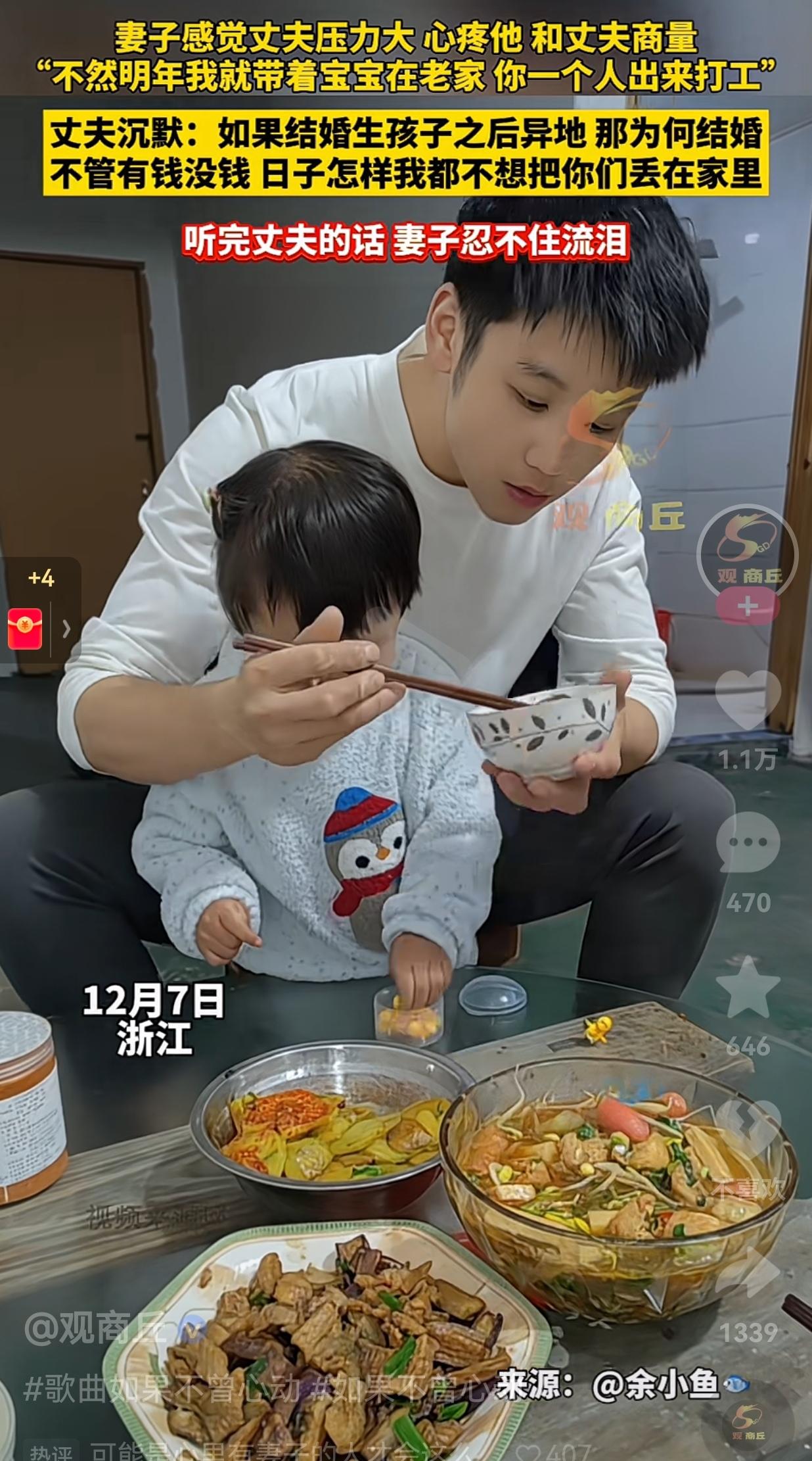 这可能就是很多家庭的真实写照吧!男子一个人挣钱养家,妻子全职带娃,家庭的重担全部压在男子的身上,一个人挣钱三个人花,经济压力本来就大,可是男子还把老婆孩子接来一起生活。 这天晚上,丈夫下班,妻子为老公准备好了热气腾腾的饭菜,男子一直沉默不语,情绪很低落。 妻子询问老公:怎么了?怎么闷闷不乐的? 男子说:压力太大了。 妻子看出了老公经济压力大,很理解丈夫,就对老公说:不然明年我带着宝宝回老家,你一个人出来打工吧。 丈夫沉默了一会儿,说了一番话真可谓字字珠玑,丈夫说:如果结婚生孩子之后要异地,那当初为什么要结婚?不管有钱没钱,日子怎么样,我都不想把你们丢在家里。 丈夫简单的几句话,很朴实,却说出了一个男人对家庭的执念。他或许给不了老婆和孩子大富大贵的生活,但是,他拼尽全力想守住一家人的团圆。妻子听完瞬间落泪,这眼泪里,有心疼,有感动。 在现在这个社会,很多人为了生活迫不得已选择背井离乡,把异地变成了家庭的常态。有人说,成年人的无奈,是想给家人更好的生活,可是在这条路上,却弄丢了最珍贵的陪伴。这个男人的选择告诉我们:日子可以苦一点,钱可以慢慢赚,但一家人必须整整齐齐在一起,才是生活最本真的甜。 其实幸福从来都不能用金钱衡量的,有时候热气腾腾的饭菜,睡前的一句晚安,孩子喊出的那声“爸爸”“妈妈”。愿每一个为生活奔波的人,都能守住这份团圆,也愿所有的努力,都能换来一家人稳稳的幸福。 大家觉得呢?欢迎大家评论区讨论留言。