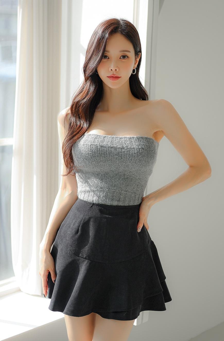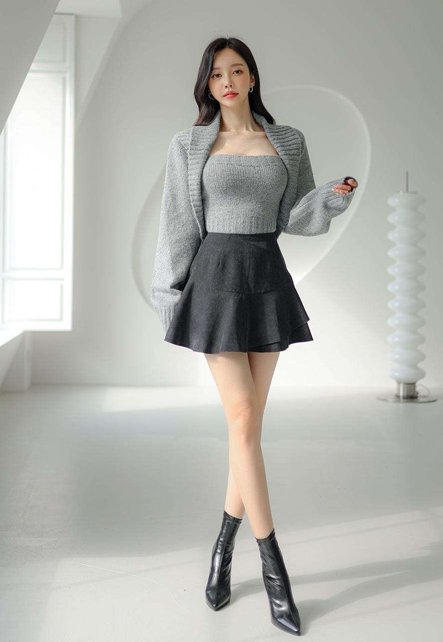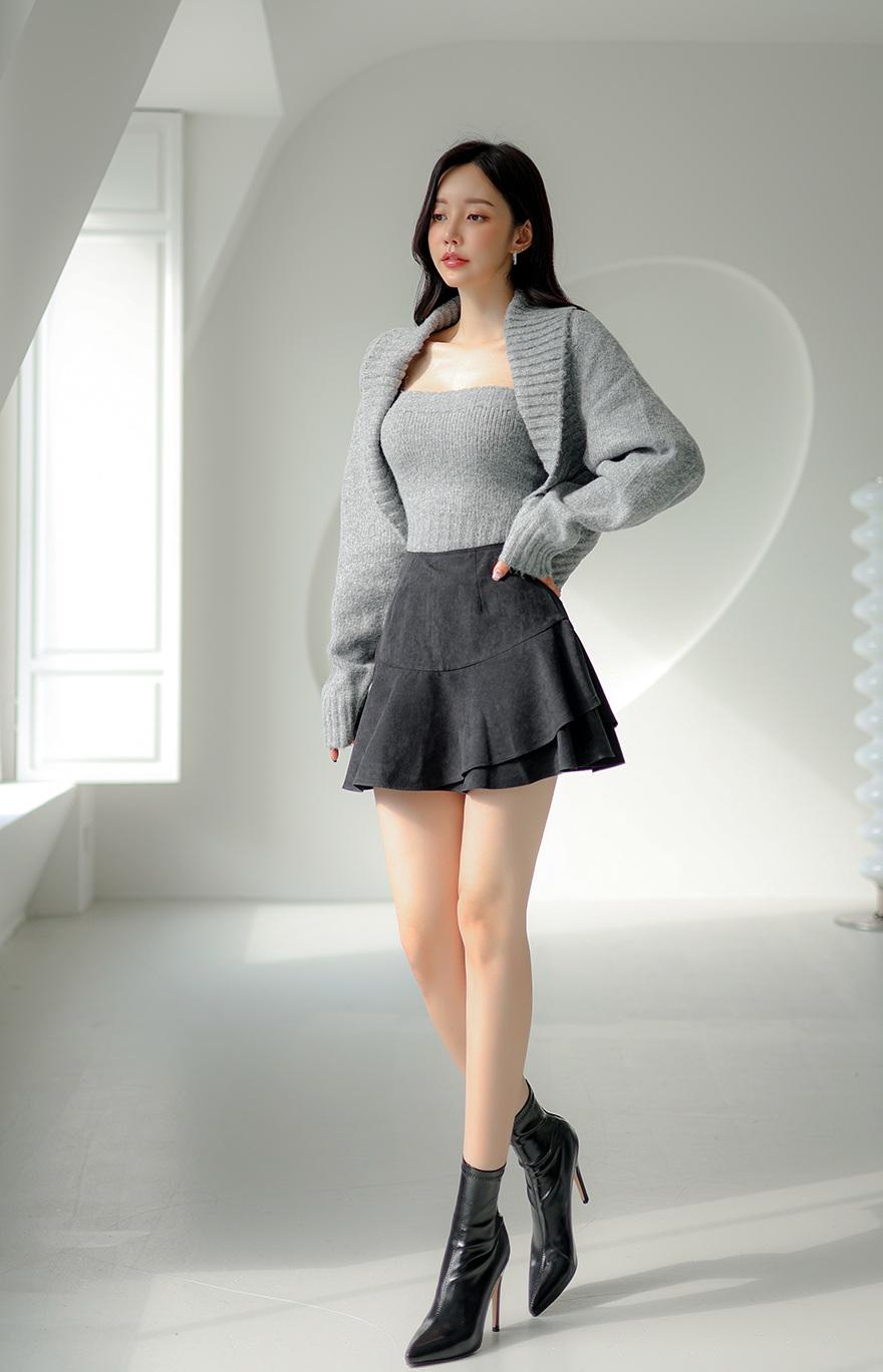 温柔少女风,灰色针织背心搭配黑色短裙,清新自然。