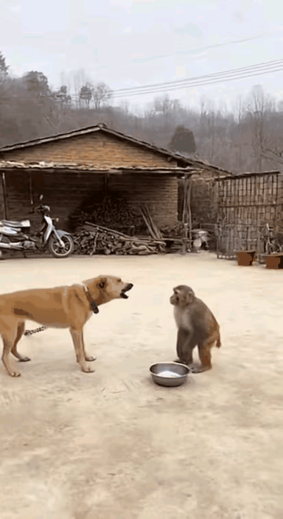 一只猴子下山找吃的的,它来一家农户的院子里。看到狗狗面前的狗盆,急急忙忙跑过去,