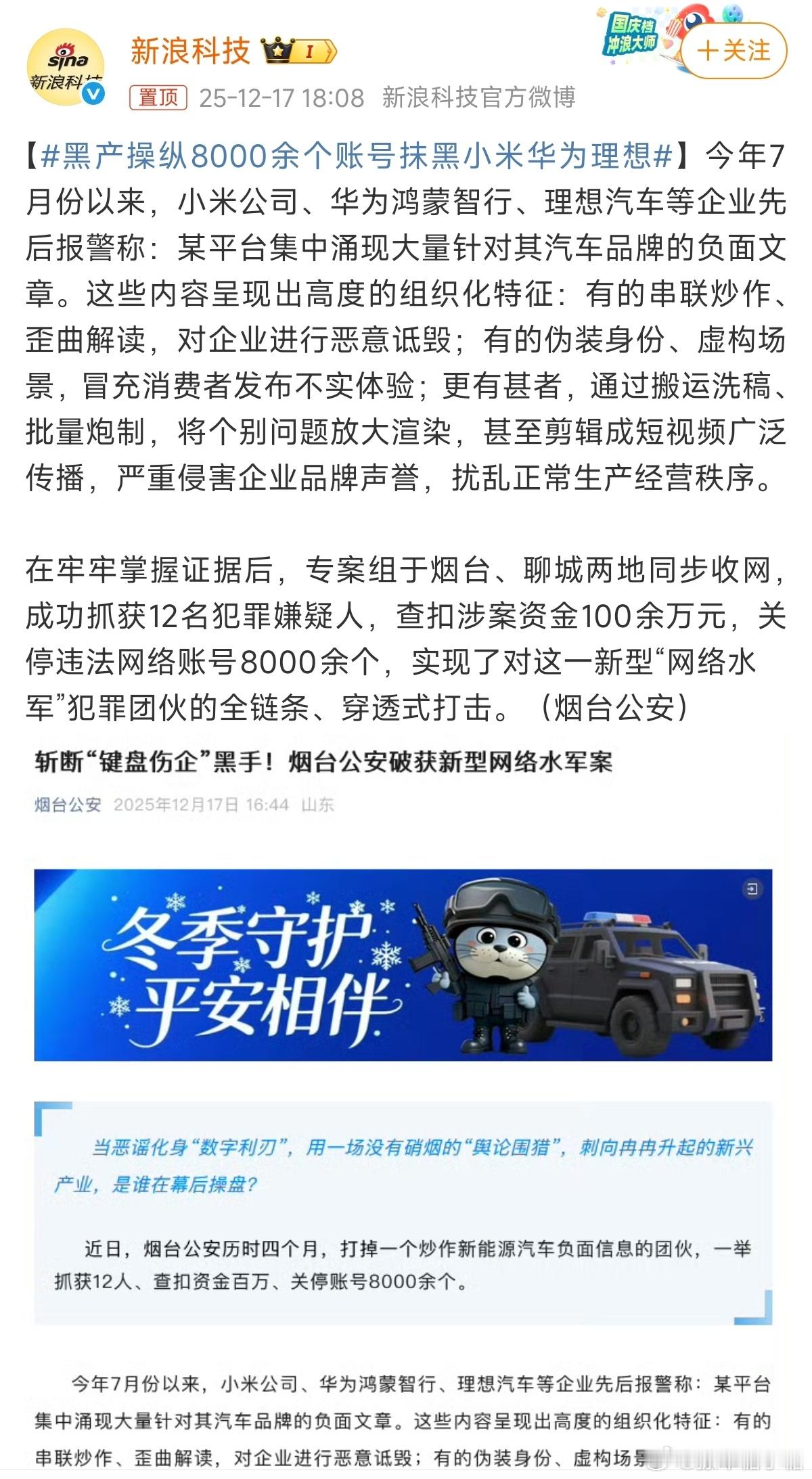 黑产操纵8000余个账号抹黑小米华为理想希望能查到源头资助的人或团队,这种恶意豢养水军的行为是在切实伤害国产自主品牌