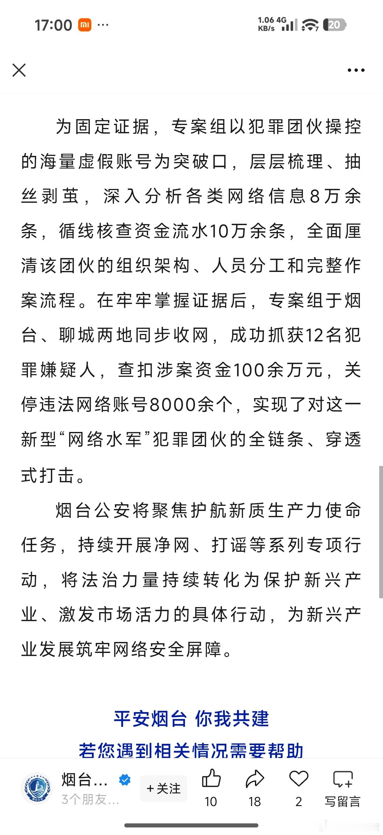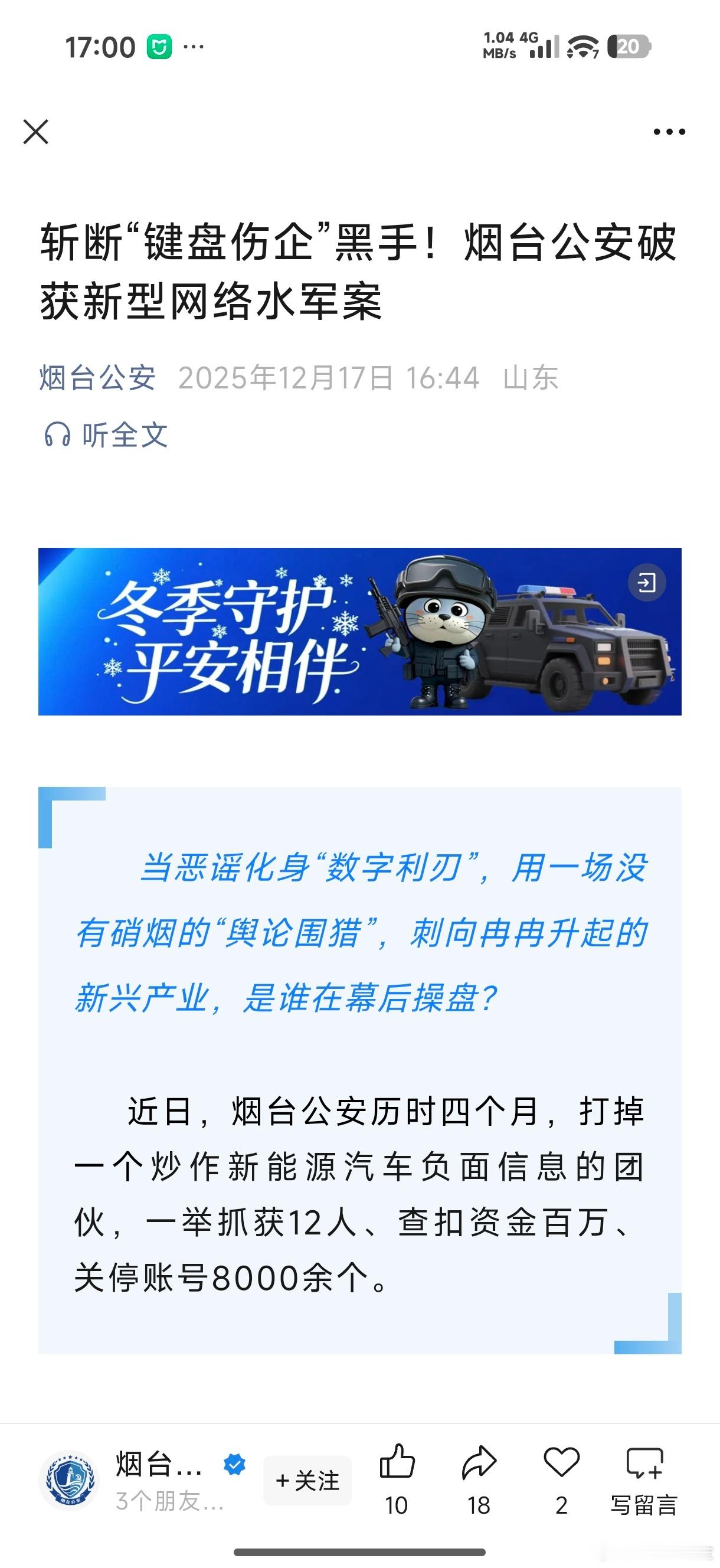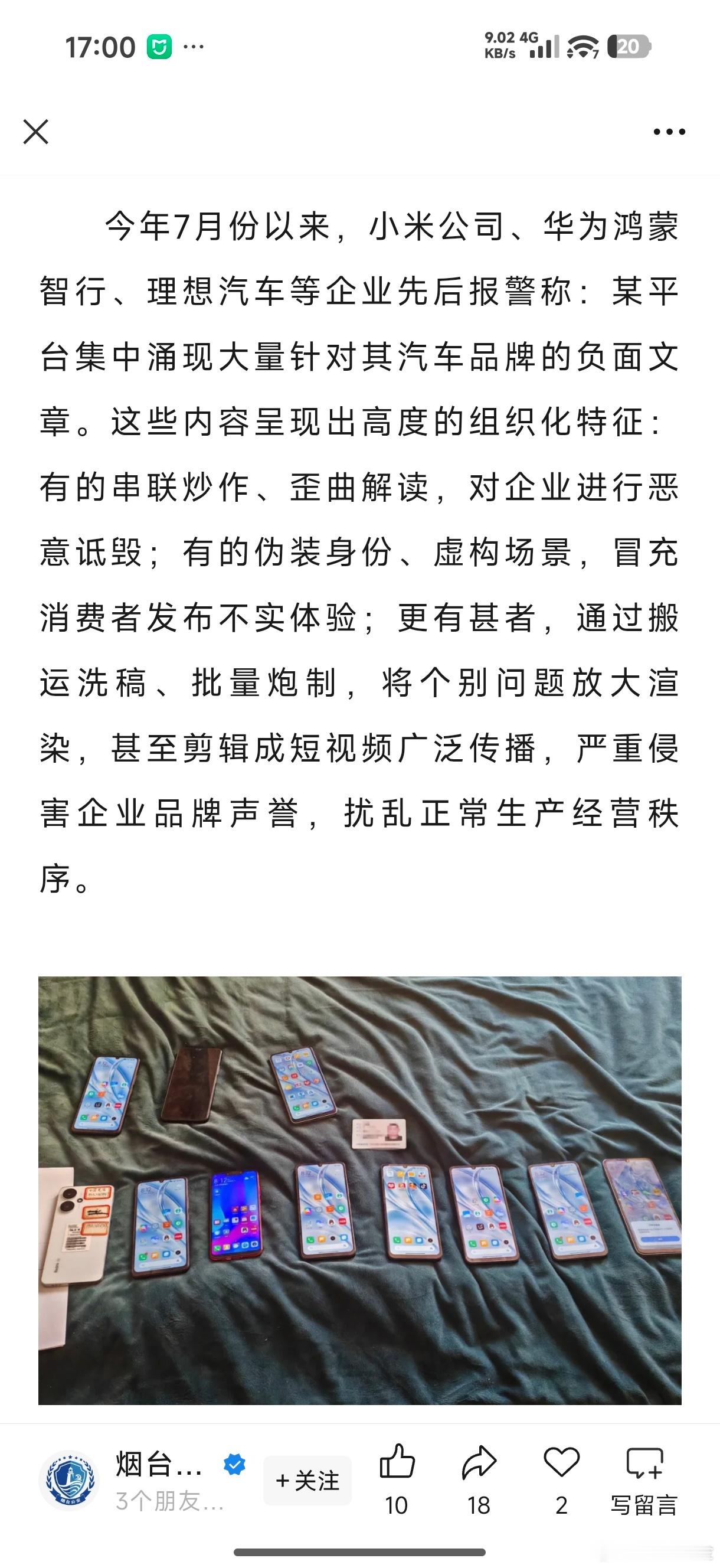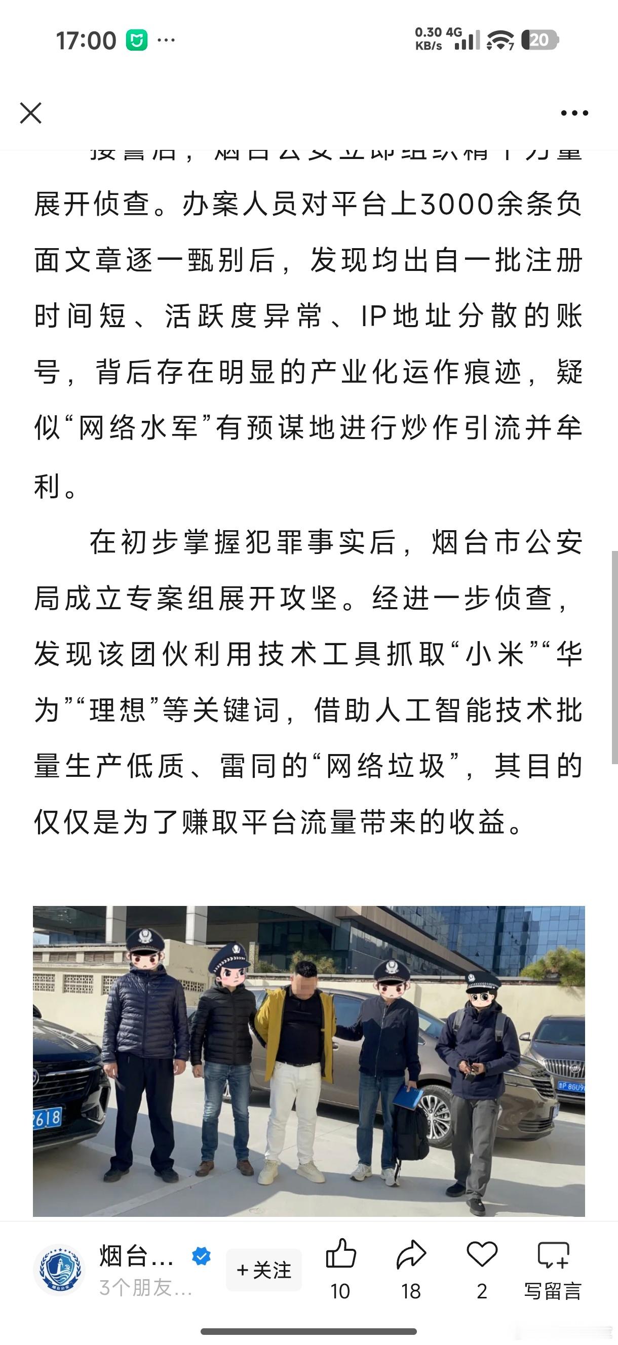 干得漂亮,打掉了专门针对新能源负面的水军团伙,小米、理想等企业先后报的警…注意!这伙人是为了获取流量带来的平台收益,涉案100余万,相关账号8000余个,只能说干的漂亮…