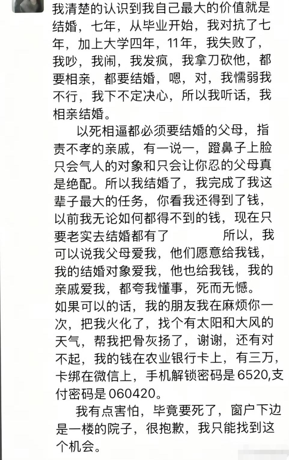 结婚当日跳楼的女教师,好可怜!现在双方家庭又起纷争,她的父母冷漠至极,对她不管不顾,她就是父母敛财的工具。 结婚当日,她从高楼纵身一跃,结束了她双面的人生。 在外人眼中,她是有编制有稳定工作的有志青年。 在学生眼中,她是有才和善的优秀教师。 但是,在她父母的眼中,她就是一个工具,一个为他们赚钱的工具,连工具人都不是,父母没把她当人。 大学四年,别的女孩在享受青春年华,她在抵抗催婚,抵抗了四年。 毕业后又抵抗了7年,28岁的人生,用了11年来抵抗催婚。 想想就可怕,考上大学的她,在父母眼中不是一个女儿,是一个待估值的商品,不停的催婚催婚,想要把商品变现,想要早点把她嫁出去,早点拿到彩礼钱。 据传闻,工作后的她,工资卡被父母拿走,每个月只有500元生活费。 好讽刺,有稳定工作的她,很缺钱。 现在她走了,最后落在一楼的院子里,一楼的邻居刚买的房子,刚装修好,还没入住,就成了有争议的房子,以后想卖也不好卖,想住心里也不舒服。 一楼的业主说,要双方家长给一楼适当的赔偿,我觉得这个要求不过分,别人的新家,就这样被毁了。 双方家长却在踢皮球,男方说,还没结婚娶到手,他们不负责。 女方家长说,人已经嫁出去了,找男方要钱去。 我能理解男方家的说法,毕竟是相亲结婚的,感情不深,他们不想负责后事可以理解的。 我没办法理解女方的父母,太冷漠了,女儿的一生都在为这个家服务,到头来一丝一毫的爱都没得到,估计她的父母现在还在埋怨她给他们造成了麻烦。 好残忍,可以想象得到她在28年里过的是什么日子,有这样的父母有多窒息。