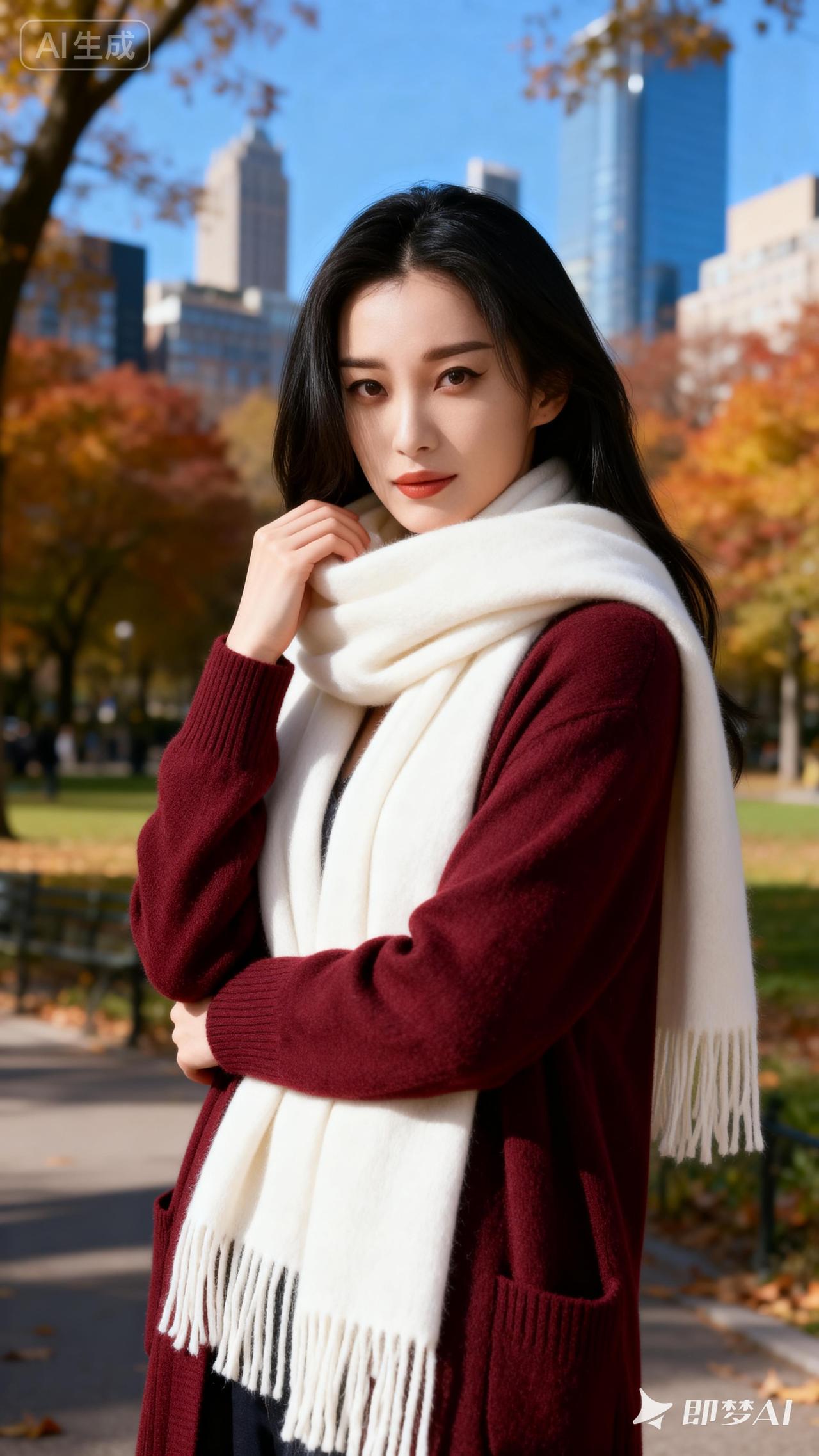 秋日暖阳下的都市少女,温柔围巾与红衣相映成趣。