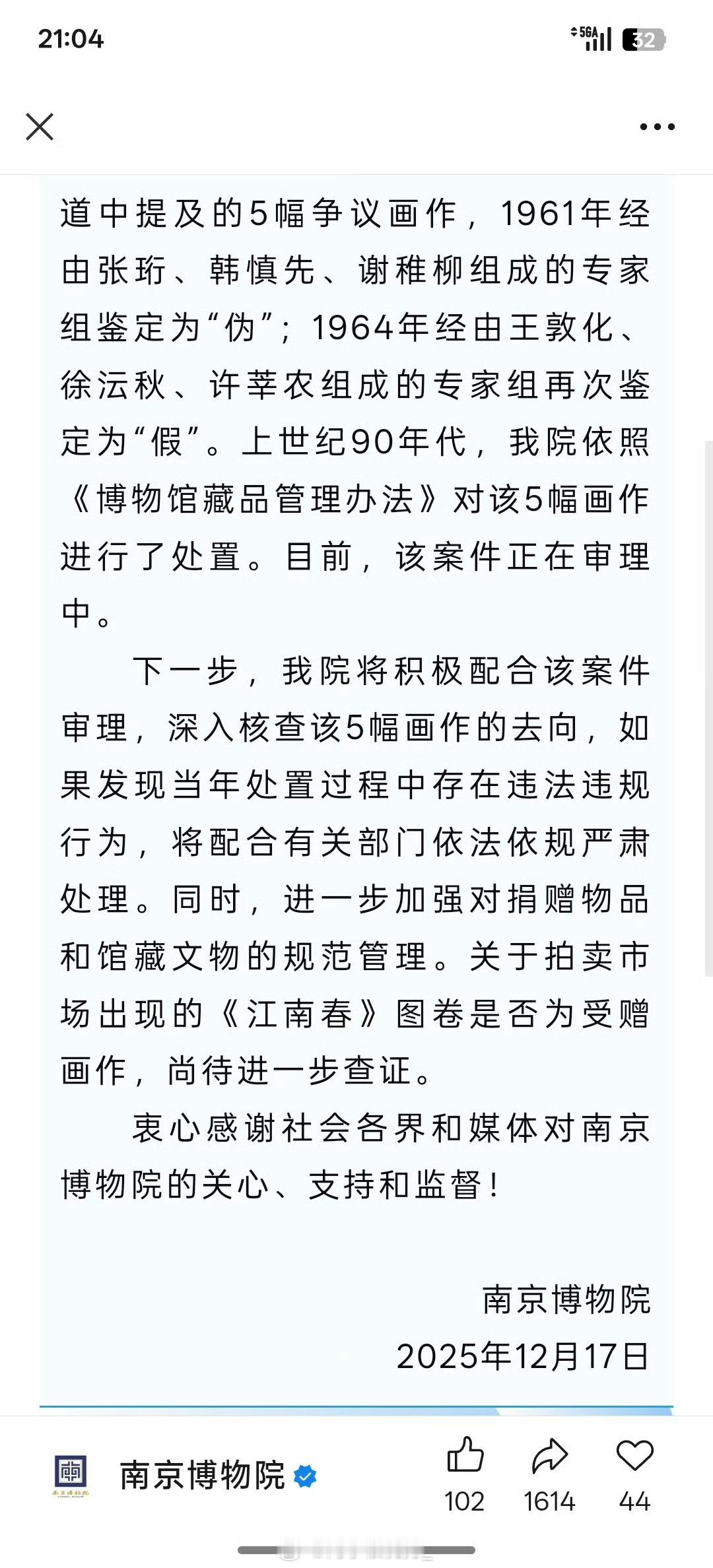 大半夜的南京博物院发公告了总结:1.案件正在审理中2.90年代这五幅画经专家两次鉴定均为“假”,后续也是依法处置3.配合调查五幅画的下落4.拍卖的这幅仇英作品是不是曾为馆藏作品,有待查证