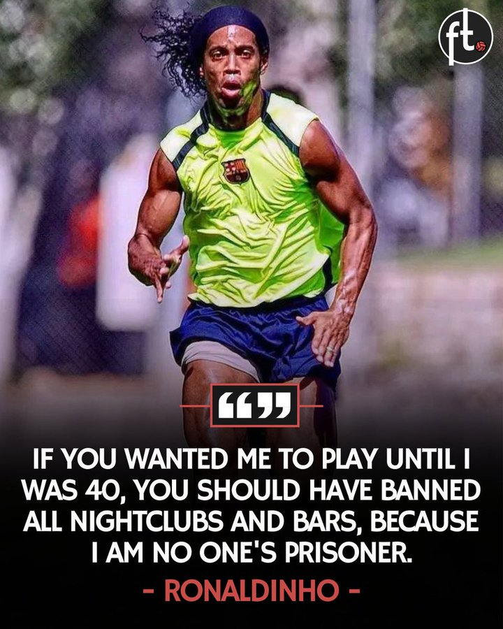 罗纳尔迪尼奥:“如果你们想让我踢到40岁,就应该禁止所有夜总会和酒吧,因为我不是任何人的囚徒。我喜欢享受青春,经常彻夜狂欢,但我总是会回到球场,创造奇迹。”