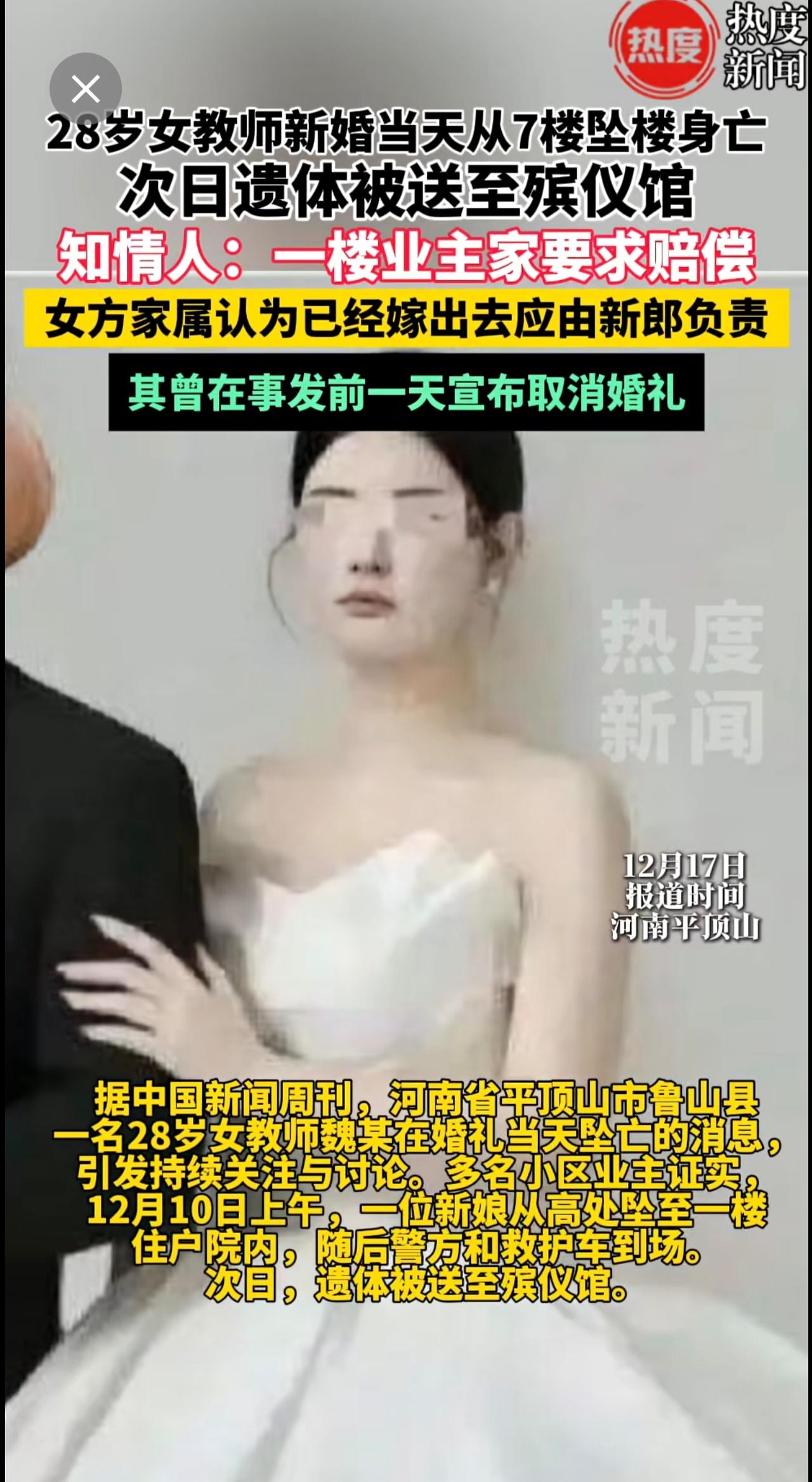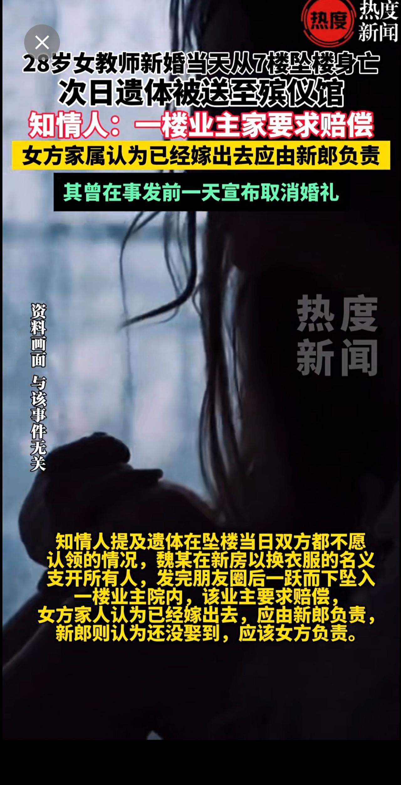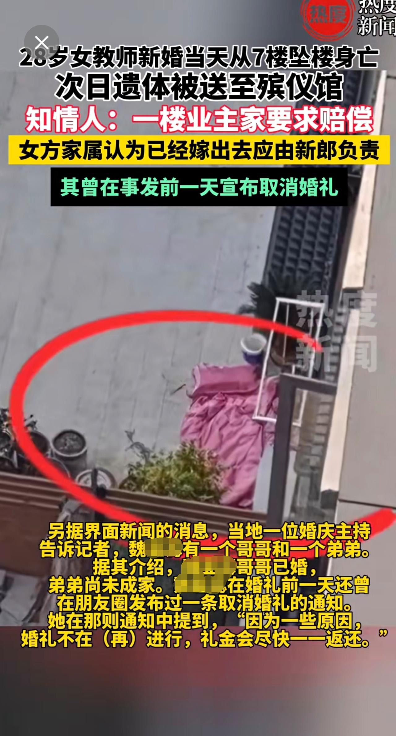 28岁女教师结婚当天坠亡疑云!知情人透露,女子一跃而下坠入一楼业主院内,该业主要求赔偿,女方家人认为已经嫁出去,应由新郎负责。催婚
