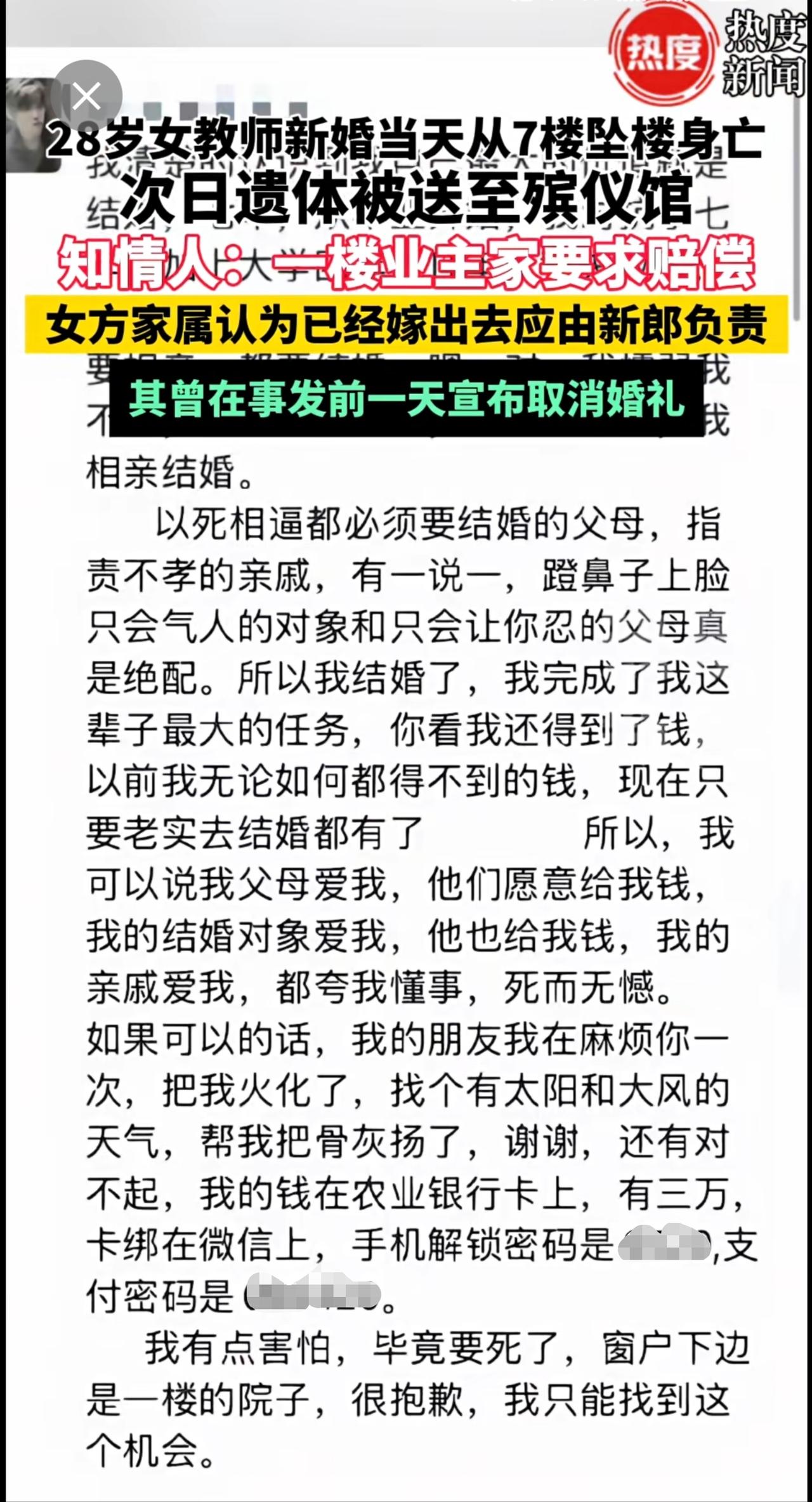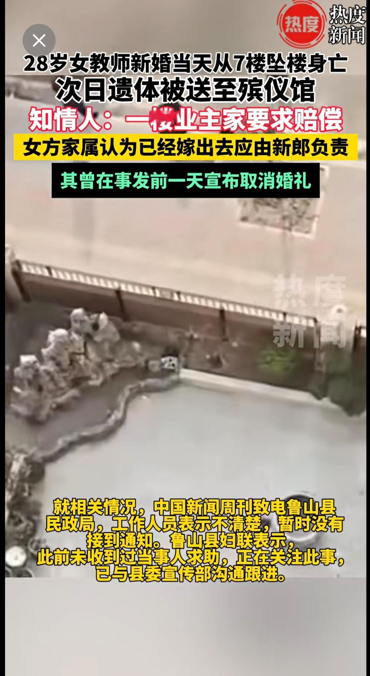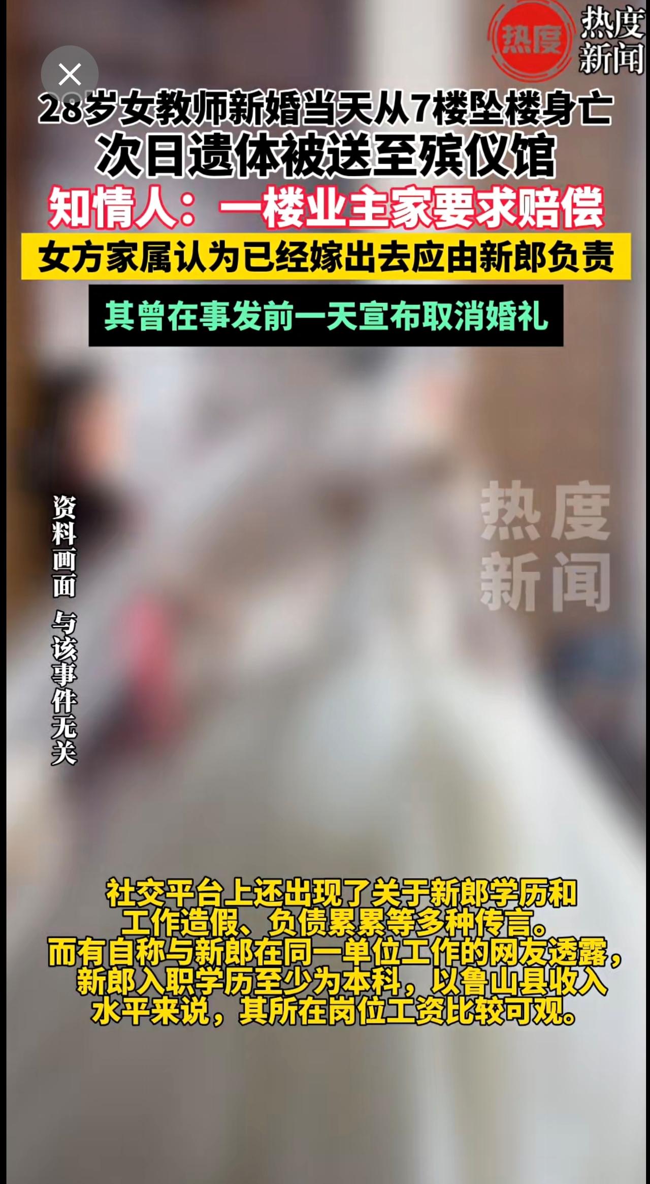 28岁女教师结婚当天坠亡疑云!知情人透露,女子一跃而下坠入一楼业主院内,该业主要求赔偿,女方家人认为已经嫁出去,应由新郎负责。催婚