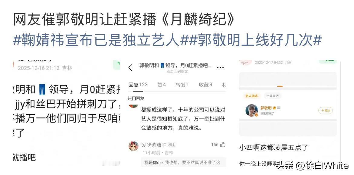 12月17日,郭敬明:听人劝,吃饱饭! 《月鳞绮纪》抬上来了,1月16日播出,距今不到一个月,郭敬明这回是真急了!昨晚时刻盯动态,今天看情况不太对,立刻就抬剧了! 一个月,感觉还是慢了点,最好提到这个月月底,那边明显不想让这部剧播出,这事越闹越大!像今天已经升级到抱勾了! 他们那边早有准备,这边也做两手准备吧! 最起码保证拍完的剧顺利播出…… 月鳞绮纪