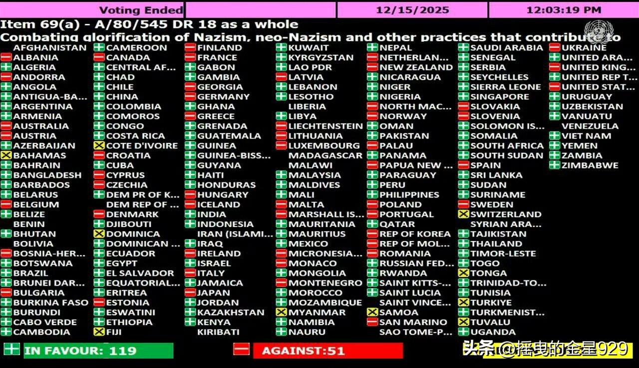 联合国大会就打击美化纳粹主义的决议再次进行了投票表决。 其中:119票赞成、51票反对、10票弃权。 比较有趣的是,过去的轴心国成员国里,只有泰国投了赞成票。 而德国、日本、意大利、芬兰、罗马尼亚、保加利亚、匈牙利、克罗地亚、斯洛伐克以及亲轴心国的西班牙都投了反对票。 以及上次德国纳粹老兵出现在加拿大议会饱受争议后,加拿大如今依然投了反对票。 当然,投反对票的还包括 乌克兰 令人意外的是,以色列居然投了赞成票。