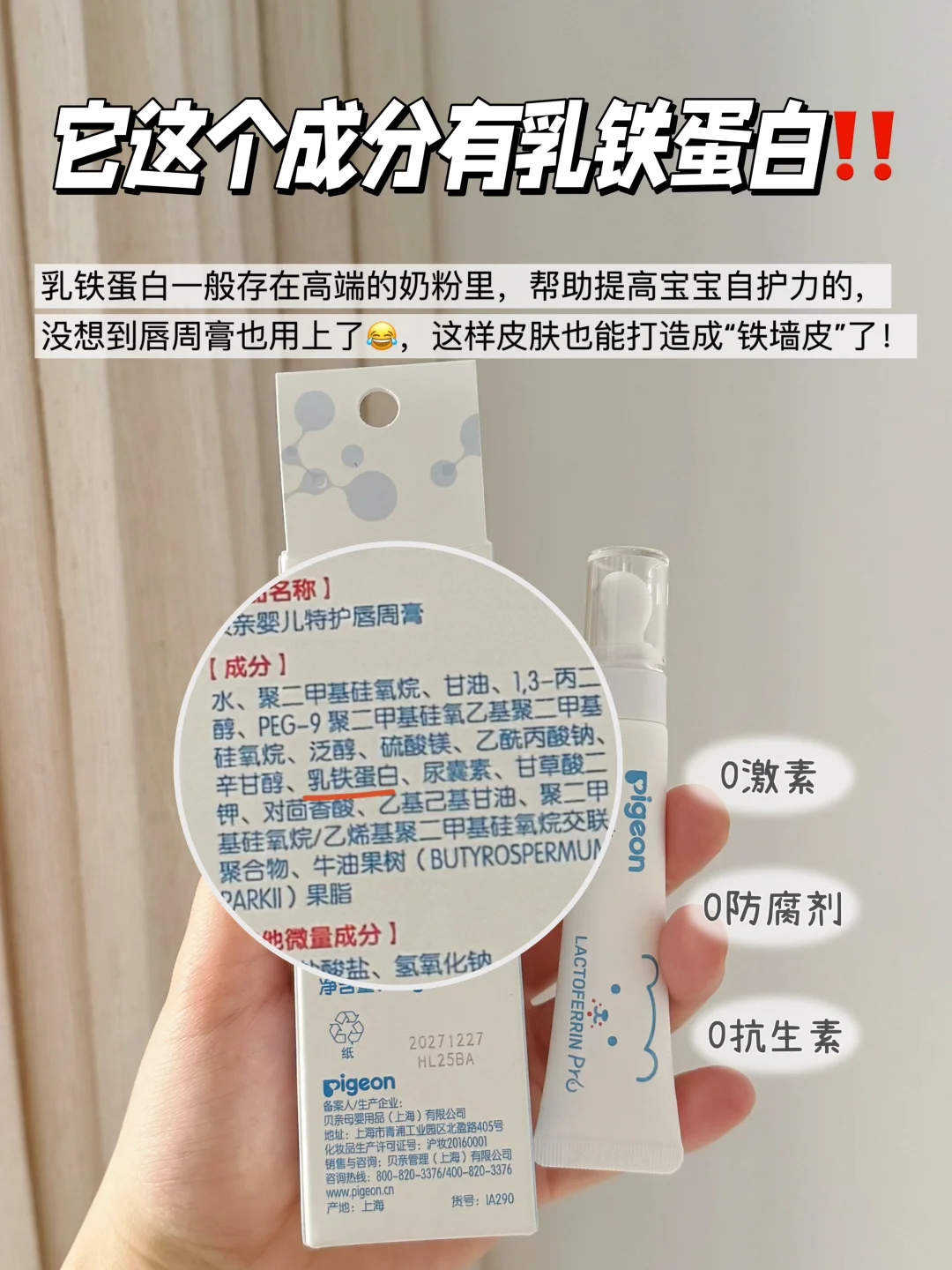 月嫂下户后,宝宝很快就到了口欲期👄,口水像开了个水龙头,幸好月嫂早就叮嘱我✔️提前买好唇周膏,流口水期间每天都勤涂抹,很少出现唇周泛红起点点的情况!大品牌用起来安心,而且我家奶瓶也是贝亲的,属于忠实老粉了。👉贝亲唇周膏的主打成分是乳铁蛋白,月嫂说一般是好的奶粉才会添加,对提升宝宝保护力有一定作用,用在唇周皮肤上可以帮助强韧唇周屏障,缓解口水、奶渍刺激。还有口周特护因子VB6+维生素原B5+甘草精华+尿囊素,滋润又保湿。美修查分全绿🍃,敏宝也能安心用。陶瓷头设计我这个懒人妈妈也很喜欢用,方便卫生。我孩子每次一有点干燥起红点点的兆头就涂上,基本第二天就会好很多了[黄金薯R]