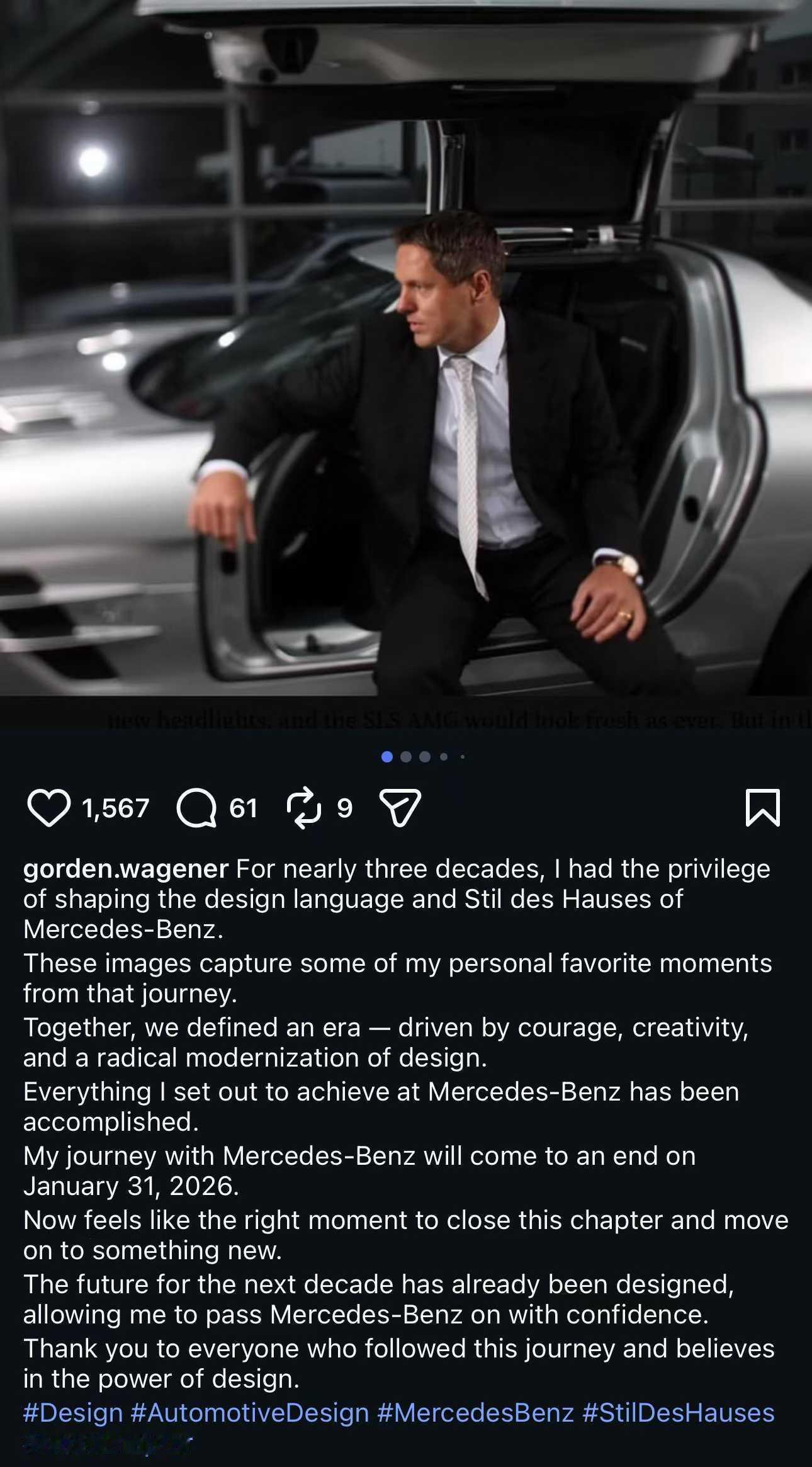 戈登·瓦格纳即将在2026年1月31日卸任梅赛德斯-奔驰设计总监。