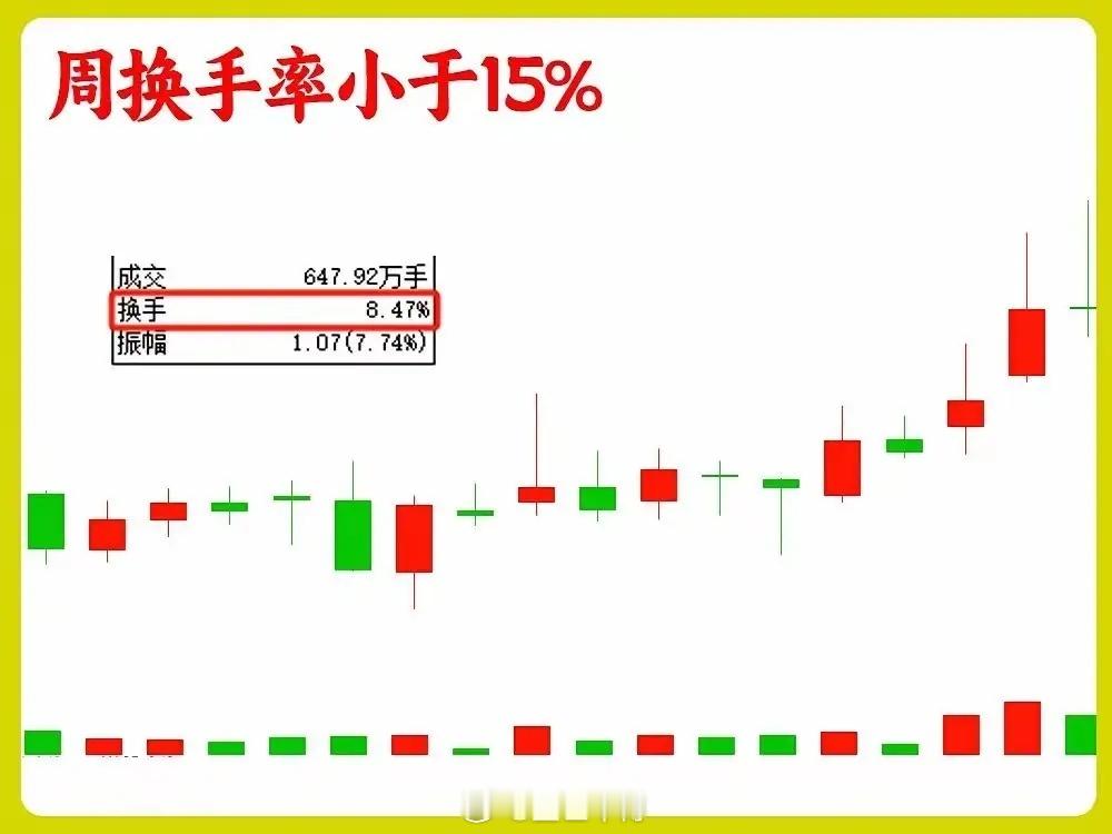 周K线换手率看穿主力,避开90%的坑做中长期投资总被主力骗?其实就看周K线换手率!这是我真金白银砸出来的经验,不用天天盯盘,每周5分钟就能辨吸筹和出货。1. <15%(中小盘)/<5%(大蓝筹):资金无人问津,筹码僵死,别浪费时间,果断换赛道。2. 15%-25%(中小盘)/5%-15%(大蓝筹):黄金区间!低位是主力吸筹,高位放量不涨就是出货。3. 25%-50%(中小盘)/15%-30%(大蓝筹):多空博弈白热化,高位出现赶紧减仓,别当接盘侠。4. >50%(中小盘)/>30%(大蓝筹):筹码一天一换,纯靠情绪炒作,中长期坚决不碰。1. 市值不同标准不同:大蓝筹5%换手算活跃,中小盘得15%以上才够看。2. 位置比数值重要10倍:同样30%换手,低位是机会,高位就是风险。炒股最忌瞎跟风,看懂周换手,就能避开主力的诱多诱空。这都是实战踩坑的感悟,没用复杂公式,新手也能看懂。