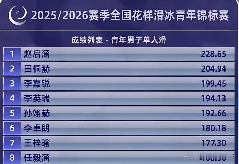 在吉林市体育馆进行的全国花样滑冰青年锦标赛结束了男子单人滑比赛,北京选手赵启涵在短节目和自由滑都排名第一,最终以228.65分断层领先,收获冠军,也如愿获得唯一的一张世青赛门票。