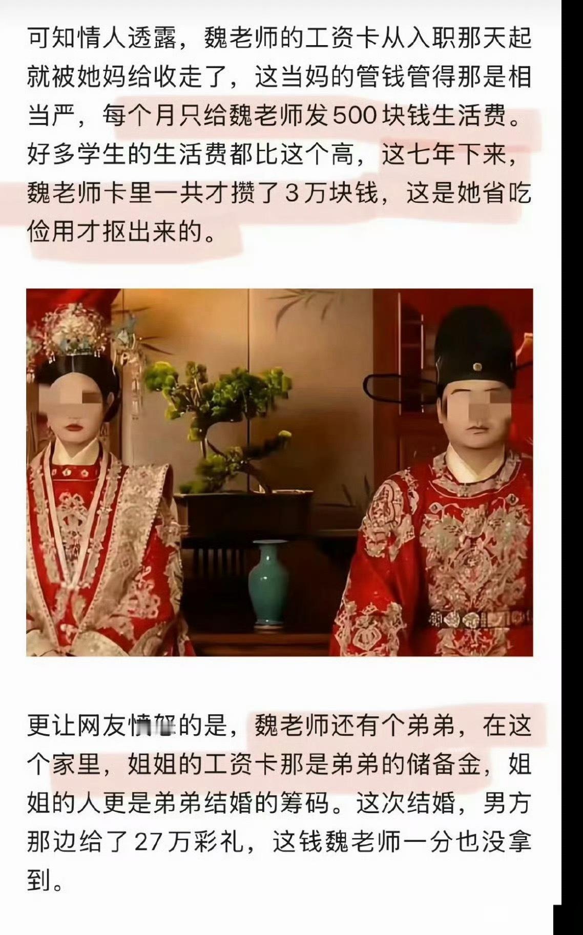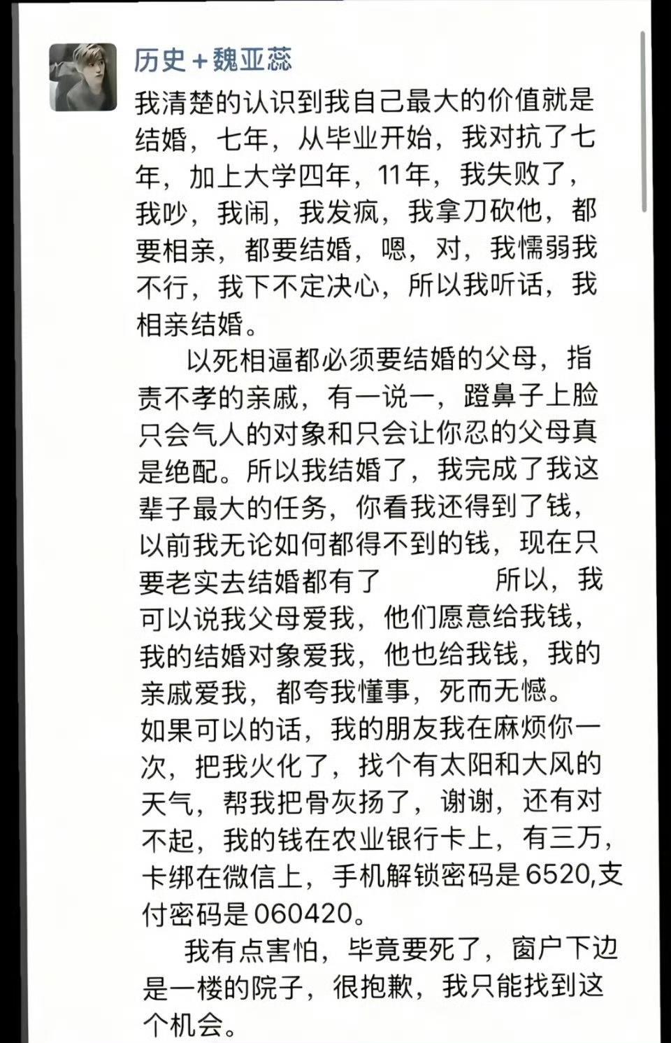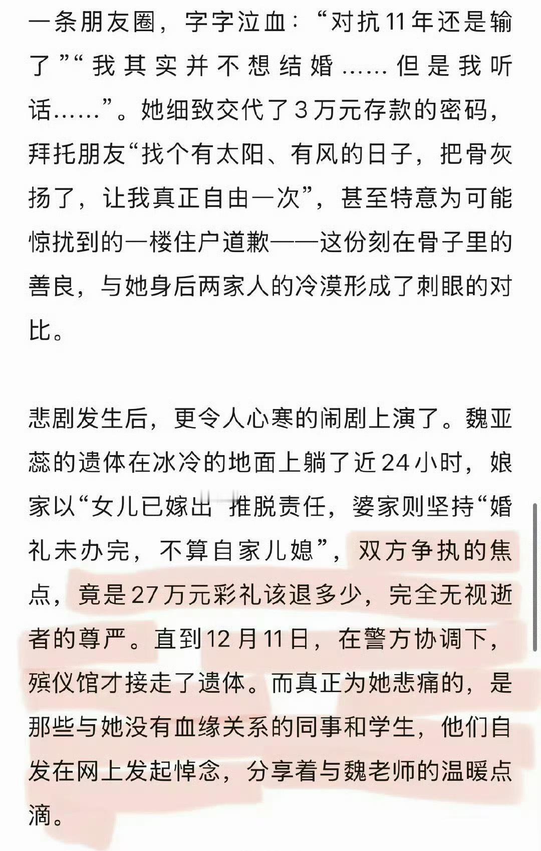 窒息的一生,28岁的女教师因不堪逼婚坠楼身亡,遗体一度无人认领。 对抗逼婚11年,去世的时候才28岁,也就是17岁上高中的时候就开始逼婚,这是父母吗?看到她有哥哥弟弟就懂了,估计她十七岁的时候她哥开始找媳妇了! 如今,女孩坠亡地点一楼的业主提出赔偿要求。女方家和新郎家开始互相推诿,女方家称姑娘已嫁人,应由男方赔偿;新郎家则表示还未娶进门,理应由女方赔偿。女孩尸骨未寒,两家人就为钱争执不休,至此,终于理解她为何宁愿跳楼也不愿踏入这场婚姻…… 新婚坠亡女教师遗体无人认领 她的遗言:帮我把骨灰扬了! 她绝望到放弃了自己,没想到身后事都没人处理…… 教师坠楼事件 鲁山教师坠楼