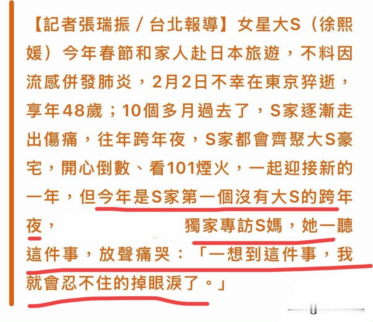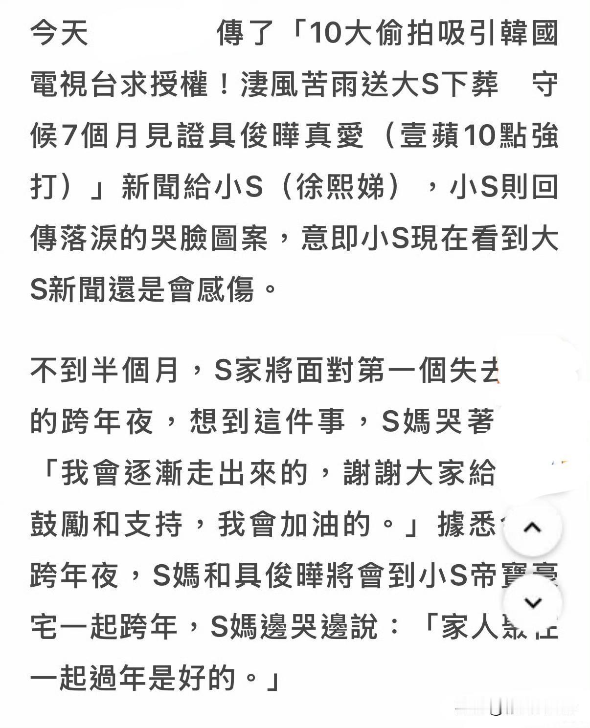 12月17日,S妈说跟具俊晔去小S家跨年! Tm以前做厨子的吧,专会撒盐? 年初传偷拍大s下葬的报道给小s,得到了小s一个哭脸的回复!年底又用“每年全家一起跨年”的点访问S妈,惹S妈伤心难过! 现在的网友其实都释然了,对于他们两家,如今也桥归桥路归路过着各自的生活! 还是那句愿逝者安息,生者节哀! 具俊晔