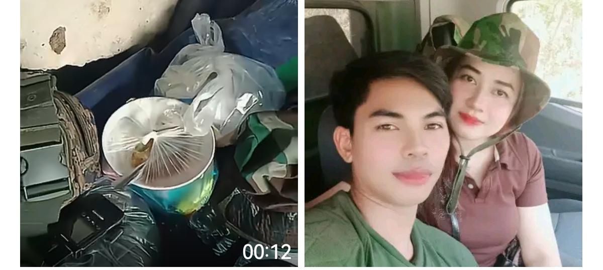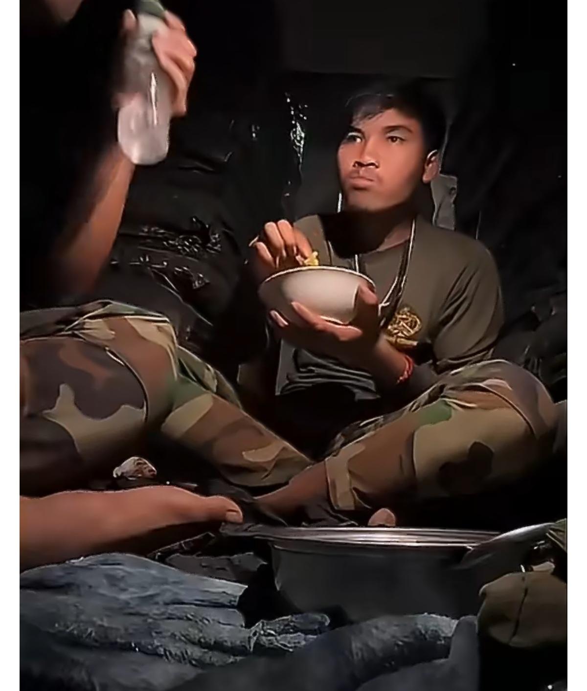 柬埔寨方面发布视频显示:在塔戈贝古寺战场上,一个柬埔寨士兵从一个的死亡的泰国军人旁拿走枪支。柬方称柬军牢牢坚守着塔戈贝古寺。 帕萨塔奎(Prasat Ta Kwai)地区,战略要地“350高地”附近的柬埔寨军人在当地的掩体工事内吃饭,结果被泰军方面使用的M134“米尼冈”转轮机枪以及40mm“博福斯”机炮的射击声响惊到。 一名24岁的柬埔寨士兵“孙隆西”(Sun Lonsi)隶属于第23边防团,他在社交媒体上发布了一段视频和一张他43岁妻子在前线掩体中的照片,并写道:“我们会相爱到永远。没有什么能将我们分开。即使前线危险重重,冲突不断,我也会永远爱你。”