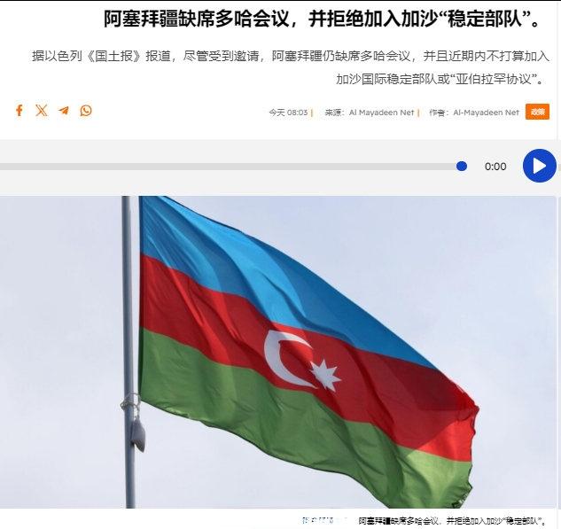 《今日以色列》报称,意大利和印度尼西亚已同意向加沙加沙地区派遣军队,但前提是保证其不与巴勒斯坦抵抗运动发生冲突,巴基斯坦也正在考虑这个问题。 ​​​ 以色列《国土报》报道称,尽管阿塞拜疆收到了正式邀请,但该国并未出席昨天在多哈举行的,由美国主持的,旨在为在加沙地带部署“国际稳定部队”铺平道路的会议。这表明,阿塞拜疆事实上不想参与这件事,且短期内不考虑加入《亚伯拉罕协议》。 ​​​