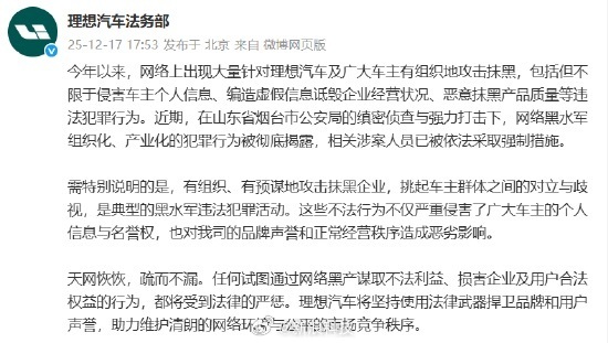 理想汽车回应黑水军理想汽车称黑水军恶意抹黑今年以来,网络上出现大量针对理想汽车及广大车主有组织地攻击抹黑,包括但不限于侵害车主个人信息、编造虚假信息诋毁企业经营状况、恶意抹黑产品质量等违法犯罪行为。近期,在山东省烟台市公安局的缜密侦查与强力打击下,网络黑水军组织化、产业化的犯罪行为被彻底揭露,相关涉案人员已被依法采取强制措施。理想汽车表示,有组织、有预谋地攻击抹黑企业,挑起车主群体之间的对立与歧视,是典型的黑水军违法犯罪活动。这些不法行为不仅严重侵害了广大车主的个人信息与名誉权,也对我司的品牌声誉和正常经营秩序造成恶劣影响。 广州