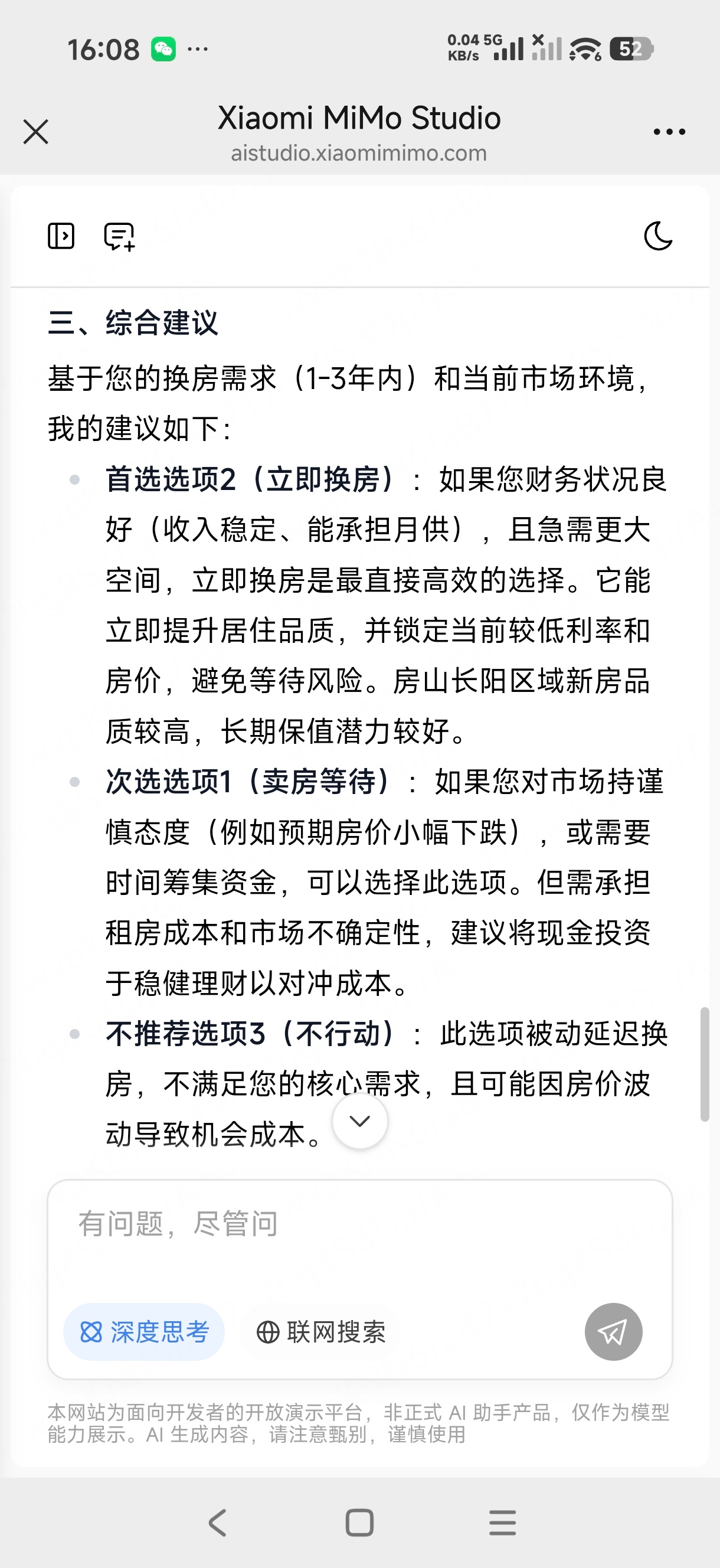 试了一下刚发布的小米MiMo大模型。我最近在考虑换个房子,让MiMo帮我分析了一下,MiMo给出了非常专业的分析报告和建议,能力确实相当强。同样的问题我分别扔给了小米MiMo、豆包和DeepSeek。三家给出的结论基本一致,但是,小米和豆包给出的分析明显比DeepSeek更佳细致可信,分析报告的篇幅也远大于DeepSeek。其中小米MiMo是唯一一个加入了理财因素的。豆包甚至基于我的问题生成了一个专门针对我的音频节目,一男一女以聊天形式帮我分析问题,听起来和真人节目完全一样,根本听不出来是AI做的。 北京