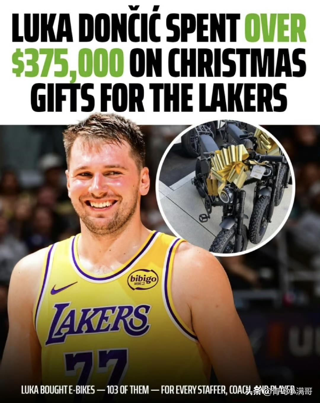 一天花了264万人民币!!!东契奇送出103辆电动自行车,共计37.5万美元! 昨天,东契奇提前给了湖人全队送上了圣诞惊喜,每个人都收到了一辆电动自行车,礼轻情意重,无论如何这都是来自队友的心意,相信大家也都很开心吧。 但是我们发现这礼物可并不轻呐,东契奇昨天一共送出了103辆电动自行车,每辆电动车的价格大约在3650美元,合计总金额花费37.5万美元,这笔钱不小了吧,如果折算成人民币要高达264万元。 这一天就花了264万元人民币也是大手笔了,当然在国外不能用我们的币种来衡量,一辆电动车3650美元,想一想是不是和我们国内的一些电动自行车的价格差不多,不过现在的新国标电动车这个价格确实很少有人买了。 东契奇真的是太好了,昨天很多队友和工作人员都试驾了电动自行车,很是满意,东契奇人员看来是相当的好,大家一定都很喜欢他吧。 东契奇 湖人 洛杉矶湖人