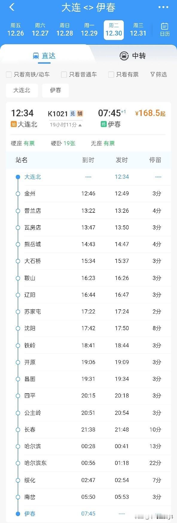 12月29日起,伊春至大连恢复开行k1022次列车,12月30日起,大连至伊春恢复开行k1021次列车 大连和伊春之间的长途k字头列车并不是一直在开行,不过在接下来的12月底到2026年初将会恢复开行,来应对春运期间增加的客流,这条线路途经东北的四大城市,大连、沈阳、长春、哈尔滨,以及黑龙江的绥化和伊春,全程距离超过1300公里。 其中伊春到大连的列车属于夕发午至列车,全程票价168.5元起,座位级别包括硬座和硬卧以及无座车票,25G型车底,经由南乌铁路,绥佳铁路,京哈铁路,沈大铁路等,由哈局哈段担当。全程将近18个小时。返程车,大连到伊春是超过了19个小时。 这套交路大连到哈尔滨区间有多趟同方向列车,哈尔滨到伊春方向也有3趟列车,而大连,沈阳,长春到伊春直达却只有这一趟。目前同方向,哈尔滨到伊春段,正在建设哈伊高铁,时间将会缩短至两小时左右,同时与京哈高铁贯通,成为我国最北部的高铁线路,大连和伊春方向也将增开高铁列车。