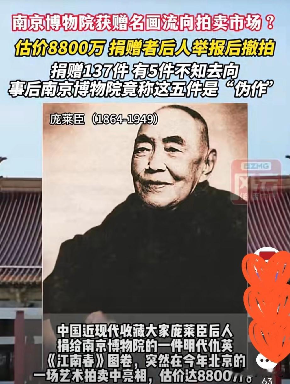 8800万拍卖传家宝!南京博物院寒了谁的心?三代人信任碎得稀里哗啦 8800万,一下就把三代人的信任打碎了。 庞家人当年把137件传家宝捐给南京博物院,想的是文脉永存,信的是国家机构。 结果呢?仇英的《江南春》直接跑到拍卖行,估价几千万。连个手续单都没有,捐赠人毫不知情,这吃相,真是太刺眼了。 让人脊背发凉的是,一旦“保管”能变成“倒手”,博物馆不就成了私人提款机? 要说这庞家人,当年可不是一时头脑发热。往上数三代,庞家就是江南有名的收藏世家,战乱年代躲鬼子、避动荡,家里的金银细软能丢就丢,唯独这137件宝贝,老爷子亲手用樟木箱装着,埋在自家后院的菜窖里,三天两头半夜起来查看,就怕受潮、怕被人惦记。解放后日子安稳了,有人出高价想买其中一件清代官窑瓶,老爷子直接把人轰出门:“这是老祖宗的文脉,不是换钱的玩意儿!” 后来之所以捐给南京博物院,庞家人琢磨得明明白白——自家后代未必能一直精心保管,万一流落海外或者被损坏,就是千古罪人。国家博物馆有专业的恒温库房、专业的修复师,把宝贝交过去,既能让更多人看到,也能真正实现“文脉永存”。捐赠那天,庞家的晚辈们都来了,看着工作人员一件件登记、装箱,老爷子拉着馆长的手反复念叨:“这些东西交给你们,我们放心!” 谁能想到,这份沉甸甸的信任,几十年后会被一个8800万的估价狠狠踩在脚下。 更让人窝火的是,被拍卖的还不是普通物件,是仇英的《江南春》!了解书画收藏的都知道,仇英作为明代“吴门四家”之一,存世作品少之又少,《江南春》更是他中年时期的精品,画里的亭台楼阁、小桥流水,每一笔都透着江南的灵秀,当年庞家得到这幅画时,特意请了专家鉴定,光是装裱就花了半年时间。这么一件国宝级的文物,怎么就悄无声息地跑到了拍卖行? 有知情人透露,这幅画被拿出来拍卖时,连最基本的出库手续都不全,庞家后人还是刷短视频时看到拍卖预告,才知道自家捐的传家宝被“倒卖”了。他们赶紧联系南京博物院,得到的回应含糊其辞,一会儿说“是误会”,一会儿说“正在调查”,可拍卖行的预展都办了,估价都标出来了,这哪是什么误会? 这事儿最让人寒心的,从来不是“丢了一件文物”,而是对“捐赠信任”的彻底践踏。庞家人捐的不只是137件宝贝,更是对国家机构的绝对信任,是三代人守护文化的初心。博物馆作为公共文化机构,手里握着的不仅是文物,更是无数捐赠者的信任。你把“保管”当成“变现”的生意,今天能把仇英的画拿去拍卖,明天就能把其他捐赠文物偷偷倒手,长此以往,谁还敢把自家的传家宝捐出来? 再说了,按照我国《文物保护法》,接受捐赠的文物属于公共文化财产,任何单位和个人都不能私自处置,更别说拿去拍卖牟利了。南京博物院作为国内顶尖的博物馆,不可能不知道这个规定,可还是出现了这样的事,到底是管理上的巨大漏洞,还是有人在背后搞小动作?这背后的问题,比文物被拍卖更值得深究。 庞家后人现在只想讨个说法:当年捐赠时承诺的“永久保管、公开展出”算不算数?被拍卖的《江南春》能不能追回来?那些还在博物馆里的传家宝,会不会也面临同样的风险?这些问题,不仅是庞家人想知道,所有关注文化传承的人都想知道。 文物是历史的见证,捐赠是善意的传递,而信任是这一切的基石。一旦基石塌了,再珍贵的文物也会失去它该有的意义。希望相关部门能彻查到底,给庞家人一个交代,也给所有捐赠者一个安心的答复,别让“文脉永存”变成一句空话。 各位读者你们怎么看?欢迎在评论区讨论。