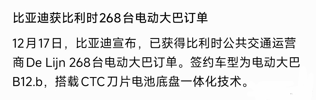 比亚迪又火了,在比利时获得超级大单最新消息比亚迪获得比利时268台电动大巴订单。比亚迪这两年在欧洲已经杀疯了,先是挤掉特斯拉,后又开始疯狂的占据欧洲本土的市场。仅仅2025年德国:增长647.5%。意大利:增长4878.1%。西班牙:增长452.3%。英国:同比增长488.5%,此前10月其新车注册量几乎达到特斯拉的七倍。法国:增长202.7%欧洲现在已经彻底认可了比亚迪的产品,2025年比亚迪含英国和欧洲自由贸易联盟在内的欧洲市场份额已升至2.0%,随着时间的发酵这一数据会再次增大。