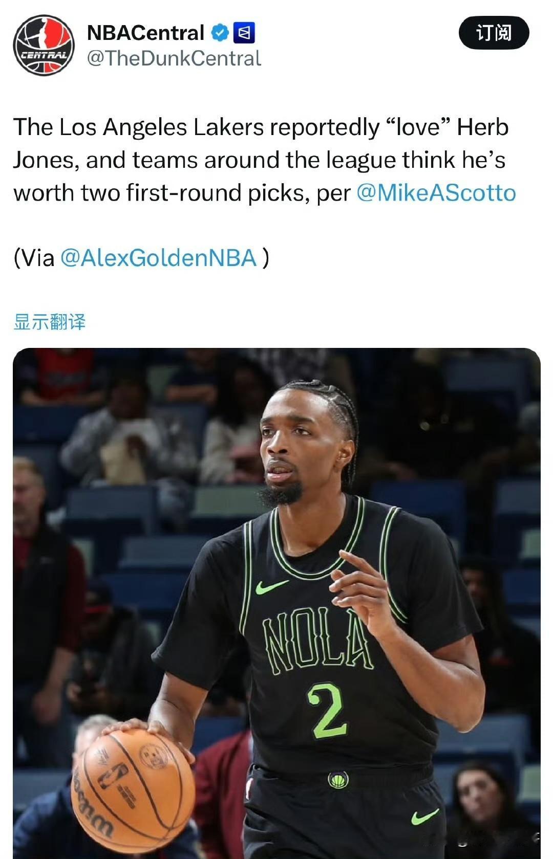他值得两个首轮!!!湖人非常有意赫伯-琼斯,但是没什么希望! 根据记者Michael Scotto最新消息透露,我了解到,洛杉矶湖人队真的“非常喜欢”鹈鹕队的前锋赫伯-琼斯,而且目前从不少球队了解到他们都认为琼斯是值得两个首轮签的。 这个价格报出来可就不低了,两个首轮一般球队也舍不得出吧,而且像湖人这样的球队你让他怎么搞到两个首轮。 赫伯-琼斯也是典型的次轮前段新秀打出名堂的球员,虽然不是什么球星级别的球员,但是他仍然是交易市场的抢手货。 琼斯毕竟也是入选过最佳防守一阵的球员,说明他的防守能力没有问题,加上有着不错的三分能力,他自然会被很多球队关注。 湖人队虽然是非常的喜欢赫伯-琼斯,但是貌似他们双方是无缘的,湖人目前是付不起这个价格的,所以他们基本上是没什么希望。湖人 鹈鹕