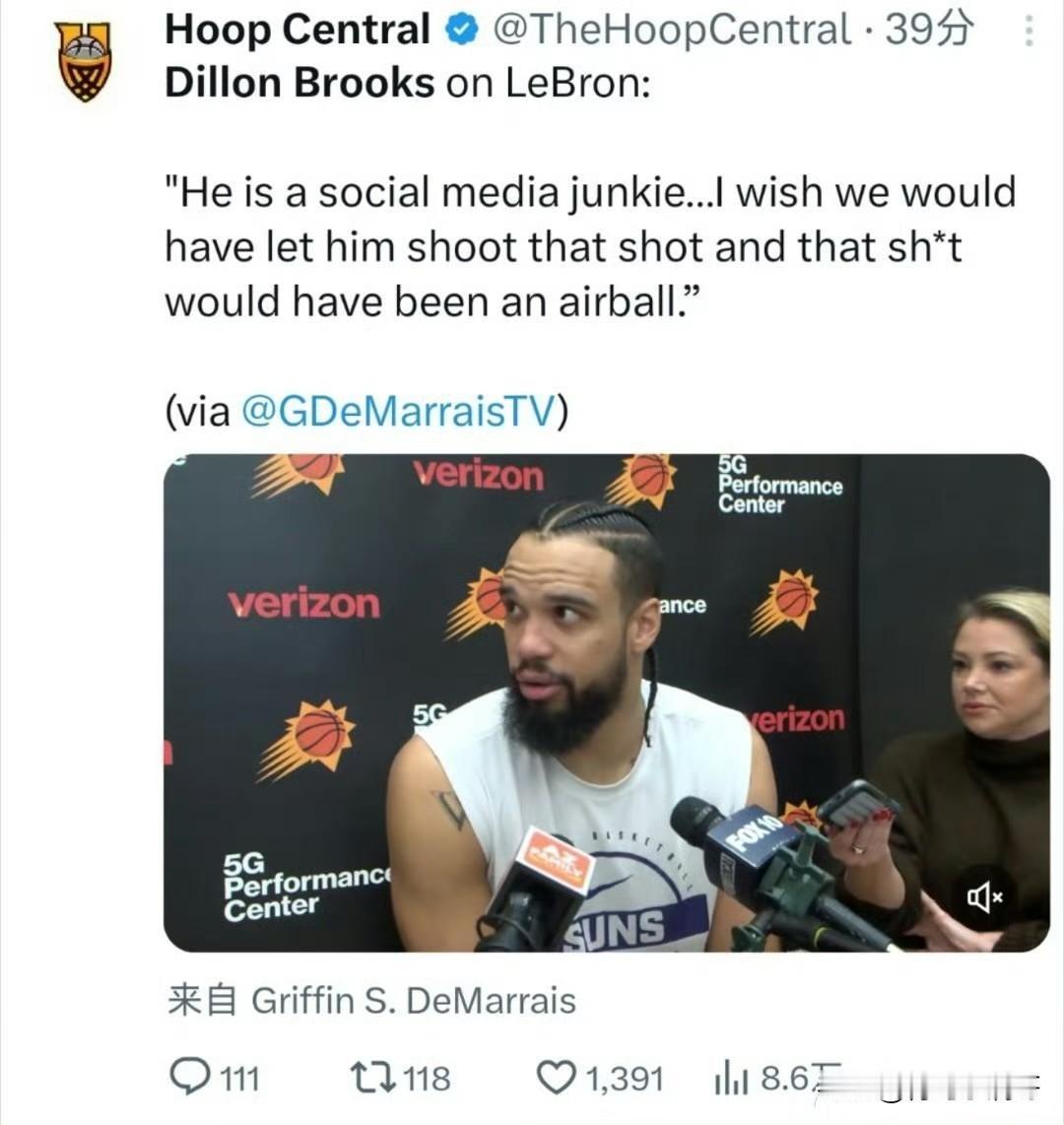 气氛到了,开干!!!狄龙:我们应该让詹姆斯投出那记三分球,肯定是三不沾! 今天比赛不多,很多球队都迎来了一个休息日,太阳球员狄龙-布鲁克斯在接受媒体采访时谈到了詹姆斯,尤其是上一场双方的比赛逆转,狄龙表示,我真的希望我们没有犯规,就让他去投吧,那记三分球肯定是三不沾的。 那场比赛大家应该都看了吧,狄龙命中三分没有被吹罚3+1,而且被吹罚了技术犯规,但是湖人没能命中,最后詹姆斯将功补过,太阳还了一次三分犯规,最终罚球准绝杀太阳。 狄龙表示,詹姆斯就是个痴迷于社交的家伙,他希望所有人都能去跟他互动来吸引关注,但是我无所谓,他爱怎么样就怎么样。 狄龙向来就是不服任何人,詹姆斯也不例外,而且狄龙也的确有资本去狂,这家伙虽然嘴上不饶人,但是在赛场上也确实有一套,有时候球队需要这样的一名球员存在。 狄龙·布鲁克斯 狄龙争议犯规 湖人 詹姆斯 狄龙冲突