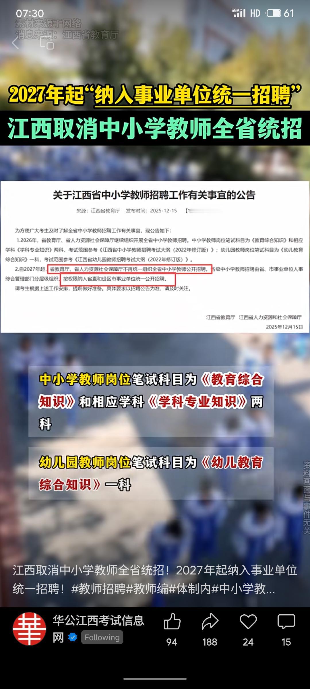 江西省宣布2026年继续组织中小学教师全省统招,2027年起取消统招,将教师岗位纳入事业单位统一公开招聘。此举或为增强地方招聘自主性,但需关注其可能带来的标准差异及对教师队伍质量的影响,以保障招聘公平与专业。