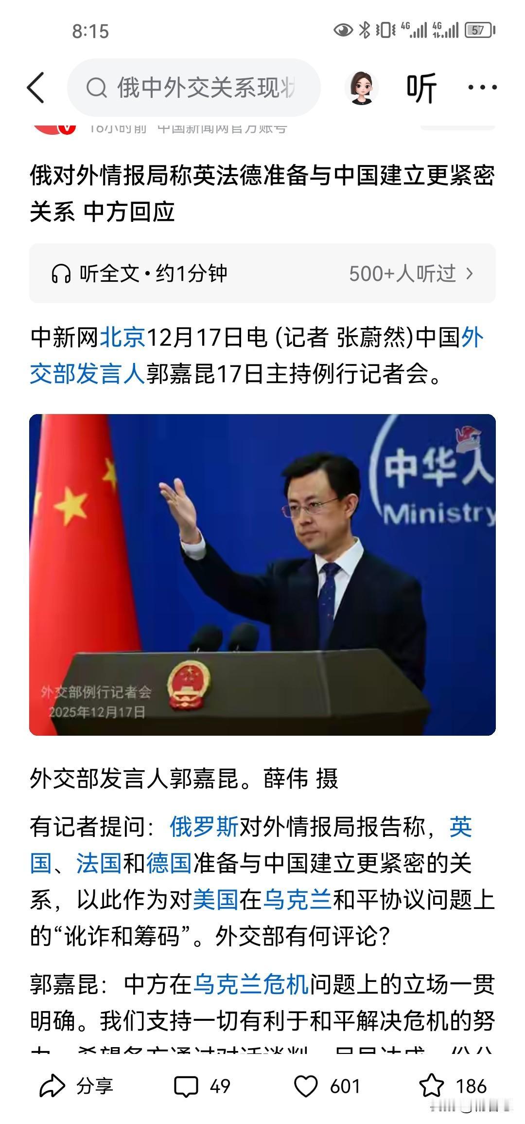 俄罗斯国家对外情报局说,为了平衡美国在乌克兰一边倒向俄罗斯,英国,法国,德国有意向中国靠拢,平衡这种关系,这种形势让俄罗斯感到担忧。作为俄罗斯有这种担忧是正常的,就好像我们也担心美国俄罗斯走在一起,是吧。我们奉行的是独立自主不结盟的外交政策,欧洲与我们改善关系合作共赢我们欢迎,但拉抬我们对付美国,则是想多了。所以国际关系这种平衡都是相对的,没有绝对优势的一面,大家都不想看到。