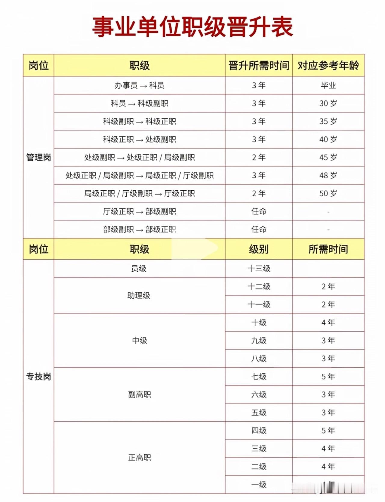 看完事业单位晋级表,我默默收起了辞职信,哪怕月薪3000也比大厂的30000舒坦。 都说事业单位是“铁饭碗”,可这碗饭端的,真是一场超长马拉松。 看看这张晋级表,从办事员到科员,3年;科员到副科,又3年。这还算顺风顺水的理想情况,现实中一个岗位多少人盯着?就算你条件够了,也得有空缺、有机遇才行。再往上,处级、厅级……那后面的“晋升所需时间”直接写成了“任命”。这两个字,道尽了多少变数和无奈。 专技岗也一样,从助理到中级,中级到副高,副高再到正高。每一步都卡着工作年限,像打游戏升级,经验值必须一点点熬。等你终于够格评正高了,一看年龄,也差不多该规划退休生活了。 所以,在体制内别问“何时能出头”,要问“自己能不能熬得住”。这里的晋升,拼的不仅是能力,更是耐力和心态。就像跑一场没有明确终点的长跑,快慢不重要,重要的是稳住节奏,别掉队。 看到这里,是不是觉得手里的“铁饭碗”突然沉重了?但也别灰心,这张表至少给出了清晰的路径。一步一个台阶,虽然慢,但每一步都算数。这大概就是体制内的生活:少点浮躁,多点耐心。毕竟,稳,本身就是一种难得的收获。