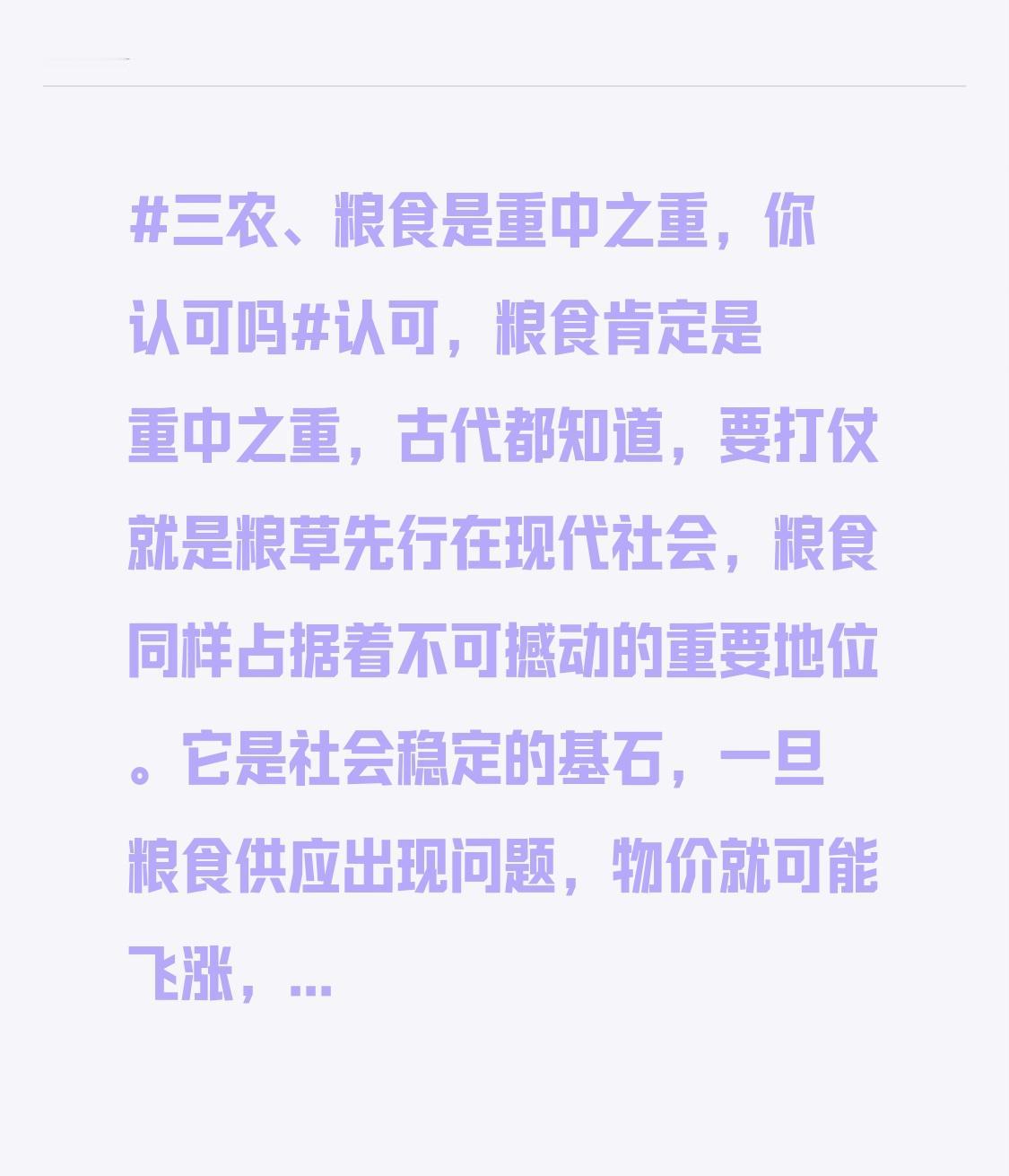 三农、粮食是重中之重,你认可吗认可,粮食肯定是重中之重,古代都知道,要打仗就是粮草先行[笑哭]在现代社会,粮食同样占据着不可撼动的重要地位。它是社会稳定的基石,一旦粮食供应出现问题,物价就可能飞涨,社会秩序也会受到冲击。 对于农民而言,种粮是他们的生计来源。但当下种粮面临诸多挑战,比如自然灾害的威胁、农资价格的波动等。政府也一直在努力,通过各种惠农政策来保障农民种粮的积极性,稳定粮食生产。 而且,粮食安全关系到国家主权独立。一个国家如果要依赖大量进口粮食来满足需求,在国际博弈中就会处于被动地位。所以大力发展三农,保障粮食产量和质量,让每一个中国人都能端稳自己的饭碗,这是强国之基。我们必须时刻牢记粮食的重要性,守护好这一“重中之重”。