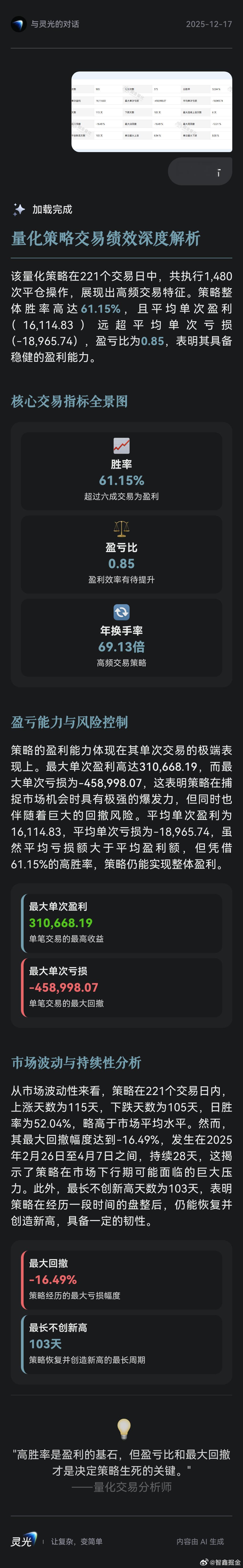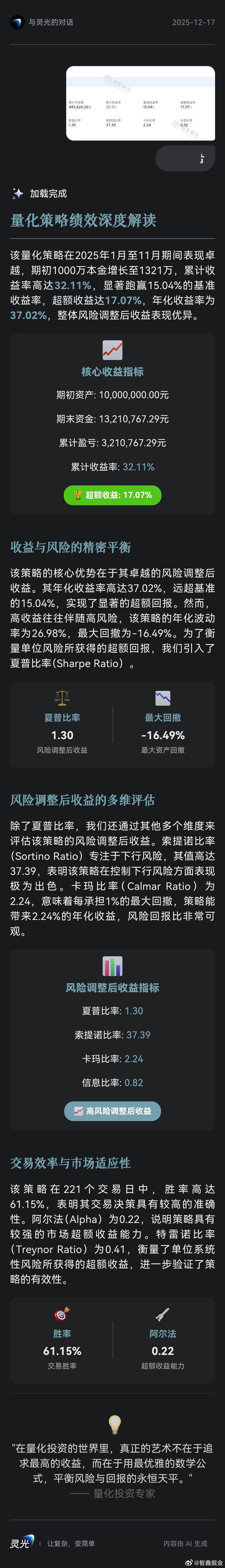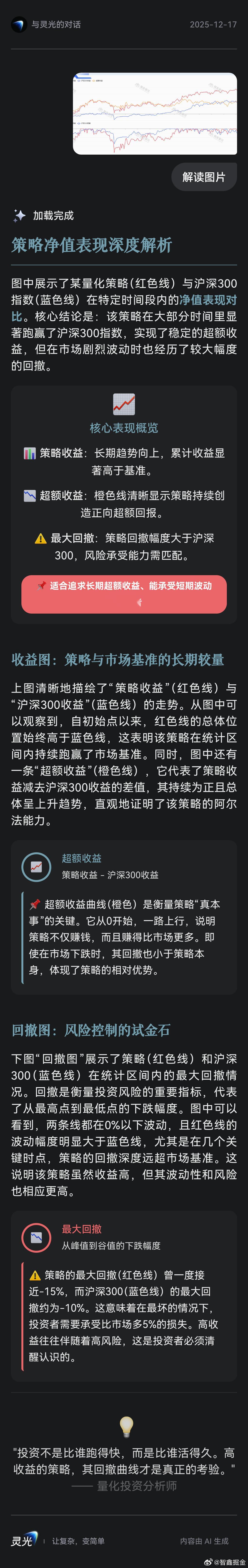 真好玩!助理跟老板汇报完今年前11个月量化策略账户收益。老板一听320万收益,开心得不得了!然后转头又让秘书把这三张 收益图 投喂给Ai,让 灵光 来解读策略运行情况。💡"投资不是比谁跑得快,而是比谁活得久。高收益的策略,其回撤曲线才是真正的考验。"冲之量形引擎a股股市行情